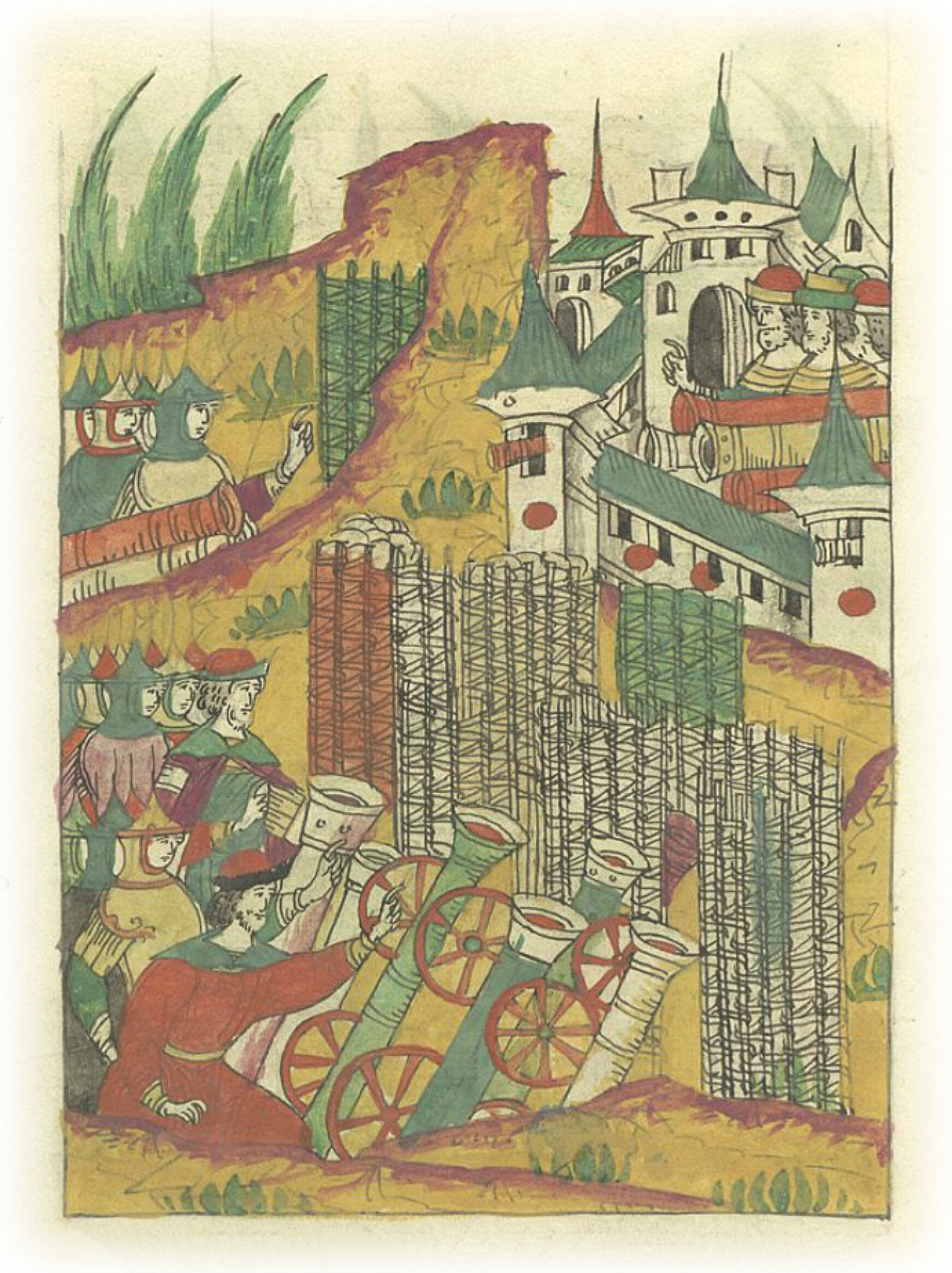 Языки говорят воеводам царя Ивана Васильевича, что магистр окопался большим рвом вокруг города Рындола, бьет из пушек и пищалей и приступает к Рындолу.