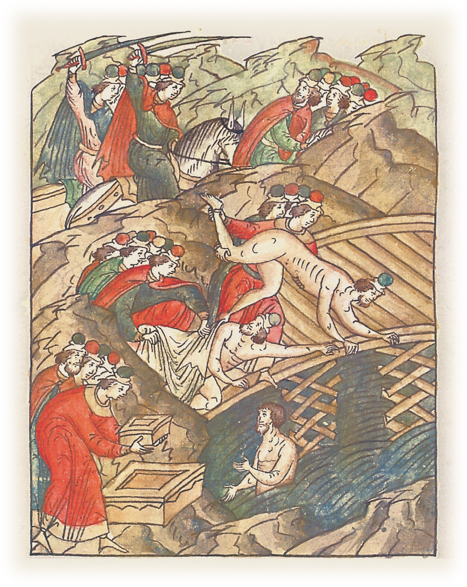 Новгородцы же гнались за Якуном и за братом его, и догнав его на пути, много били; и почти при смерти оставили его, и обнажили его всего, в чем мать родила, и сбросили его с моста в воду; но Бог смерти не предал его, ибо прибрел к берегу; и потому не били его, но взяли у него тысячу рублей, а у брата его – пятьсот рублей.