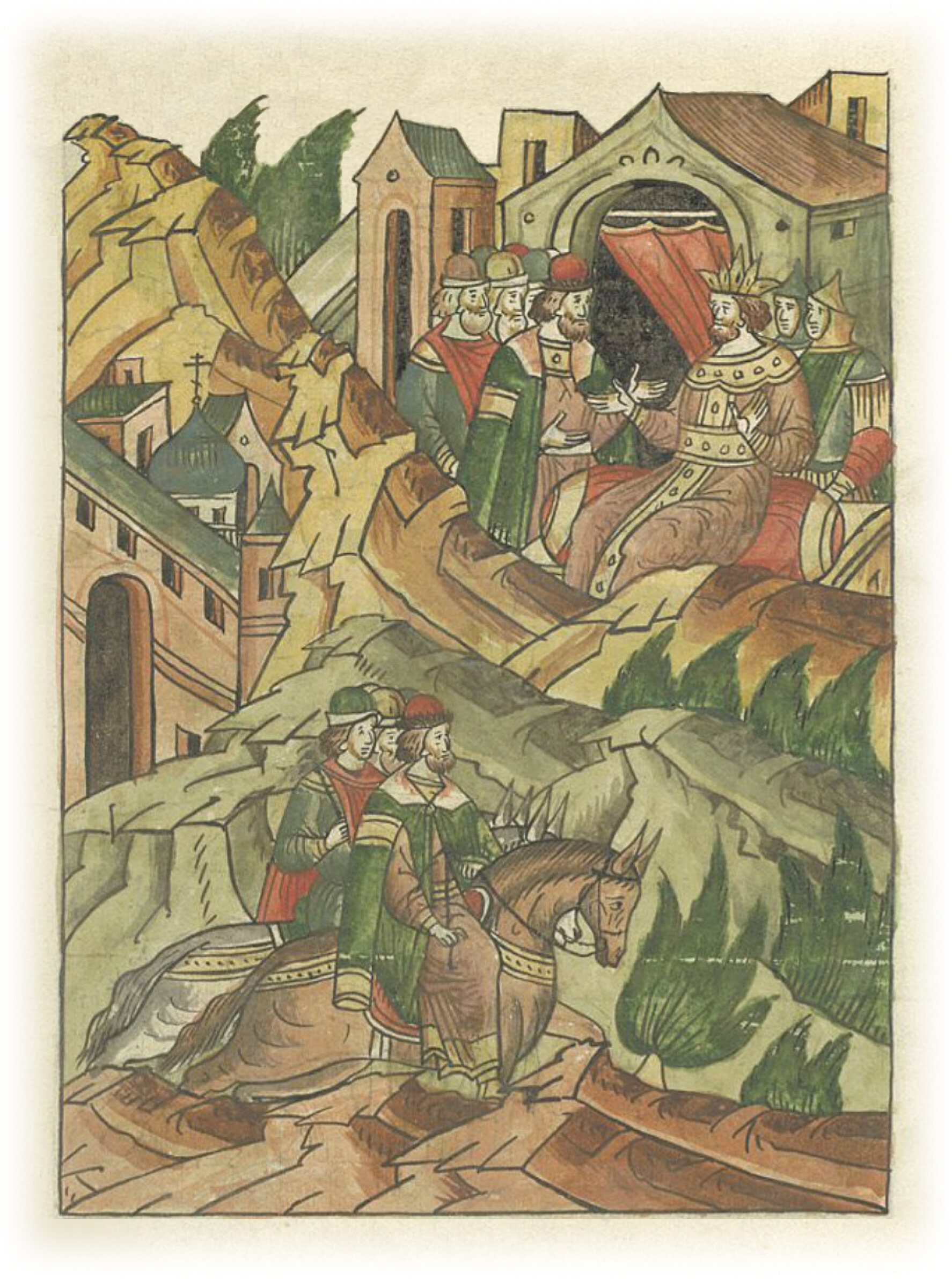 Князь Андрей Ярославич идет в Орду к царю Батыю, который принимает его с почестями.