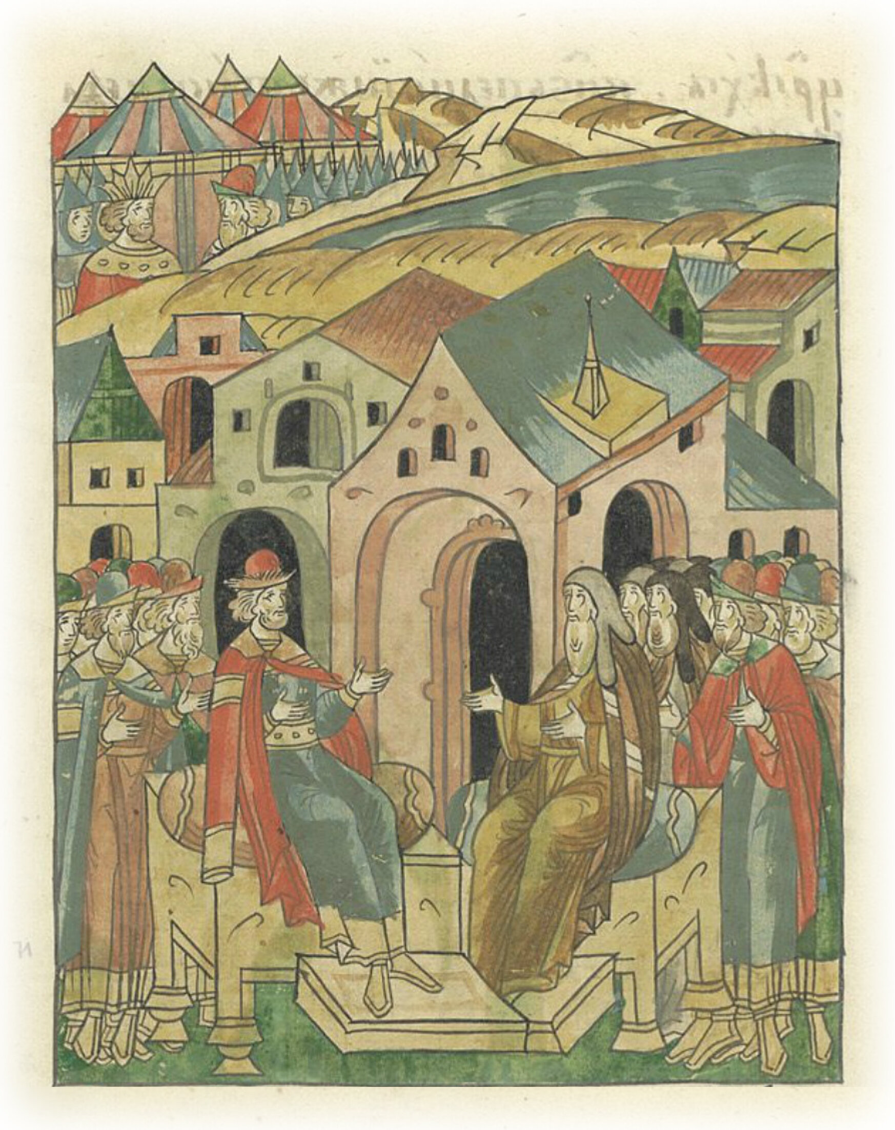 Митрополит всея Руси Киприан наставляет великого князя Дмитрия Ивановича перед сражением с татарами.