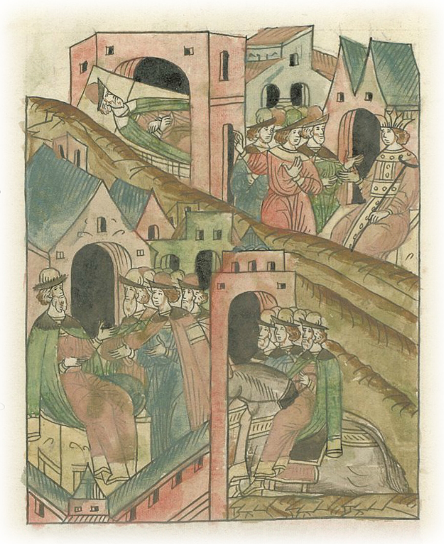 Ругодивские посадники Яким и Захар приезжают в Москву. Воеводы царя Ивана Васильевича Алексей Адашев и Иван Михайлов сообщают им, что государь пожалует их, если сдадут его воеводам помимо Ругодива Вышгород.