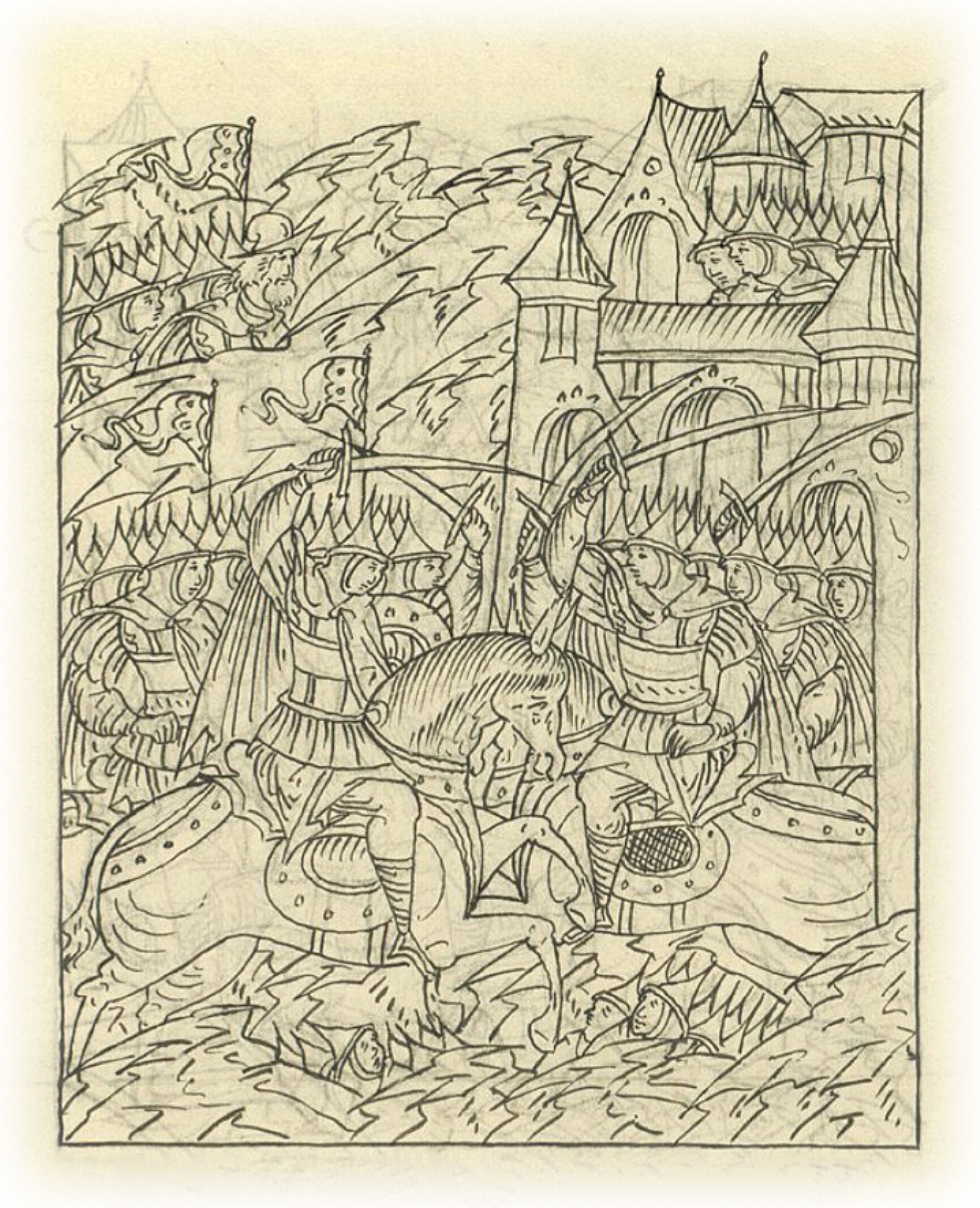 Горожане же стеклись со всех мест и вышли из всех ворот, и бились зло; и воины царя жестоко приступали к городу и секлись с татарами.