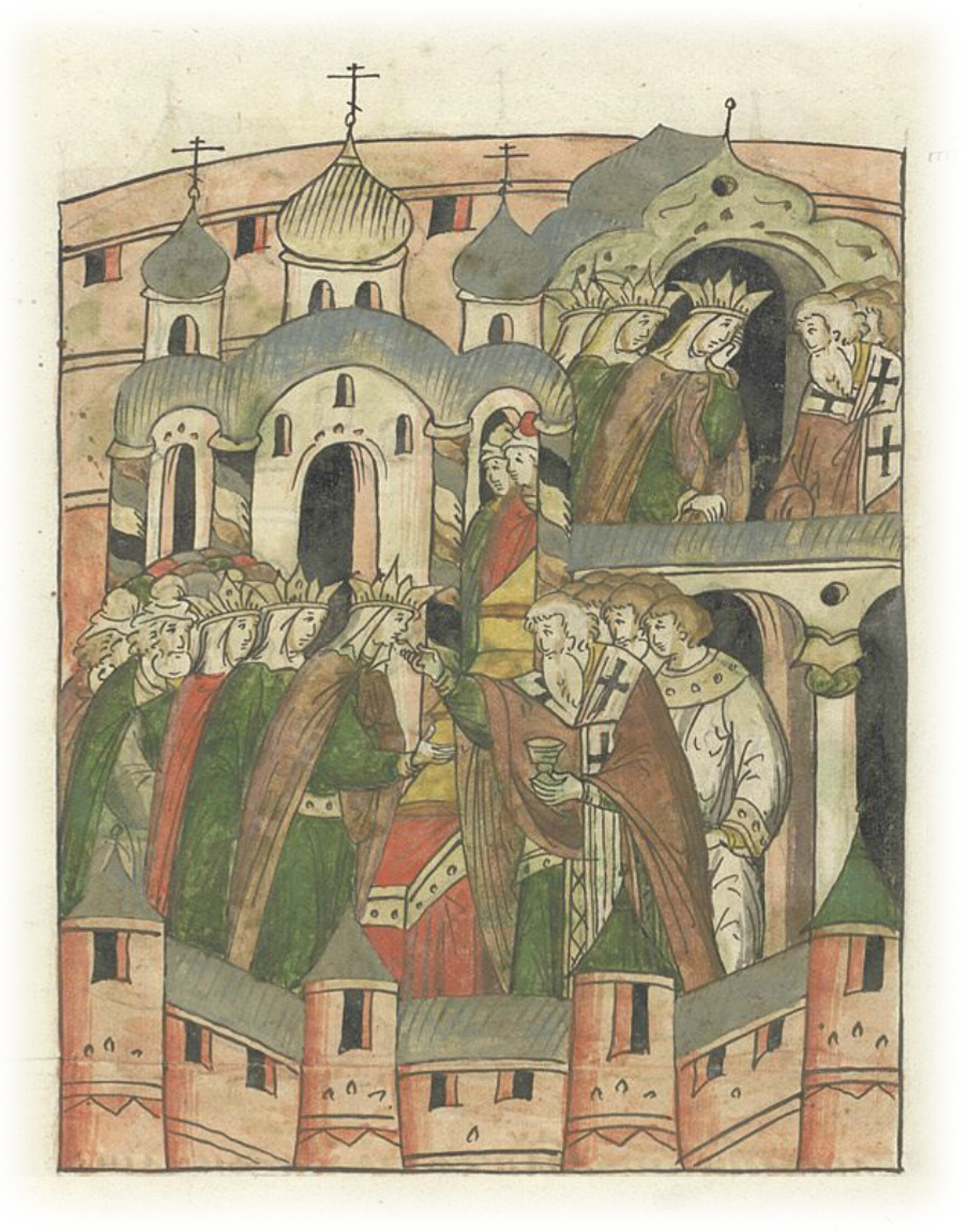 А владыка Митрофан и великая княгиня Юрьева с дочерью, и со снохами, и с внучатами, и с боярами, и с боярынями, и со многими людьми бежали в церковь; и причастились святым тайнам Христа Бога нашего, и затворили врата церкви, и взошли в церкви на полати, и затворились.