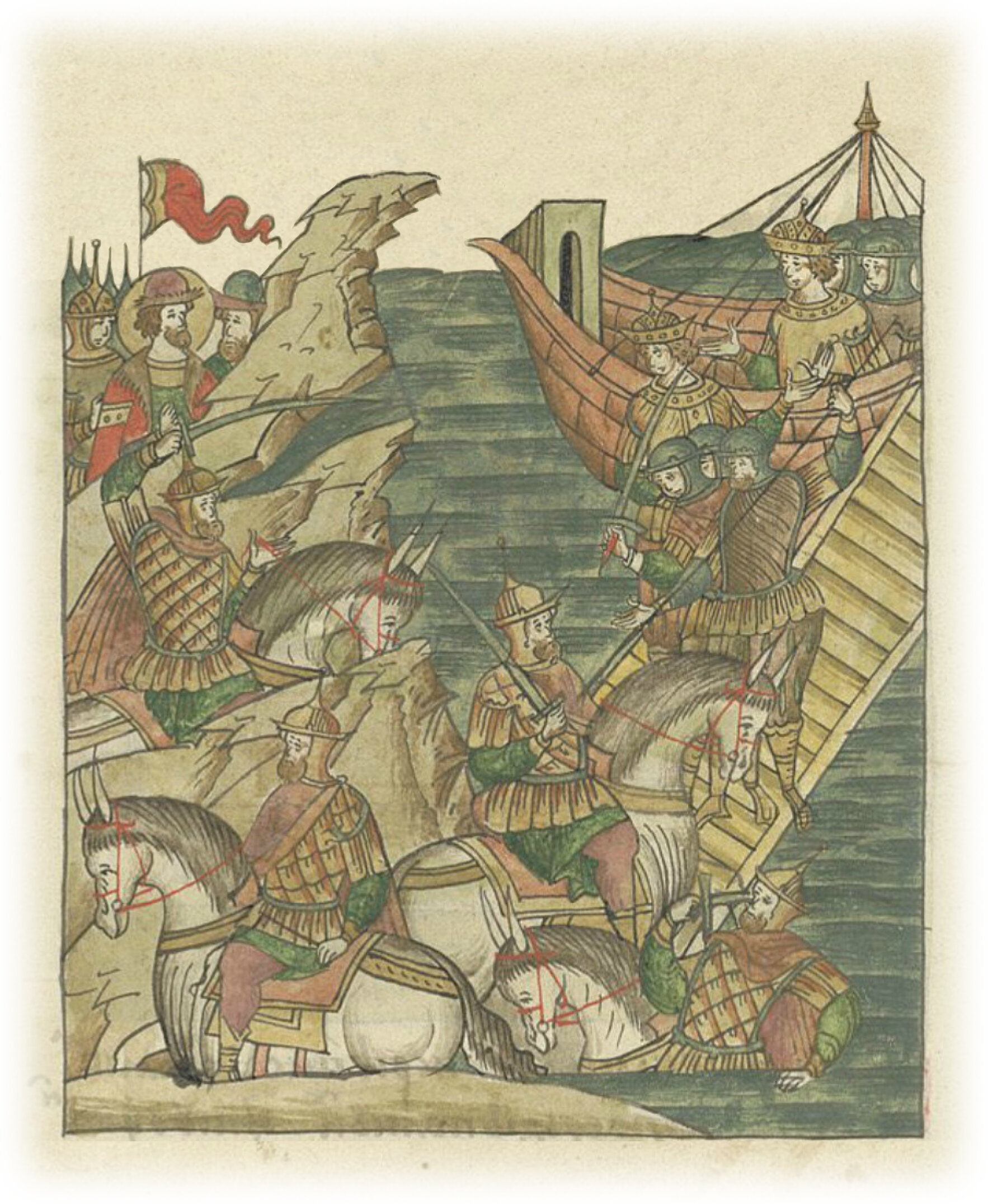 Первый – по имени Гавриил Олексич; он наехал на шнеку*, и видя мчащегося королевича, въехал за ним по доске, по которой сходят, до самого корабля и, вбежав на корабль перед ним, обернулся и сбросил его с доски вместе с конем в море. По Божьей воле ушел оттуда невредим. * род судна.