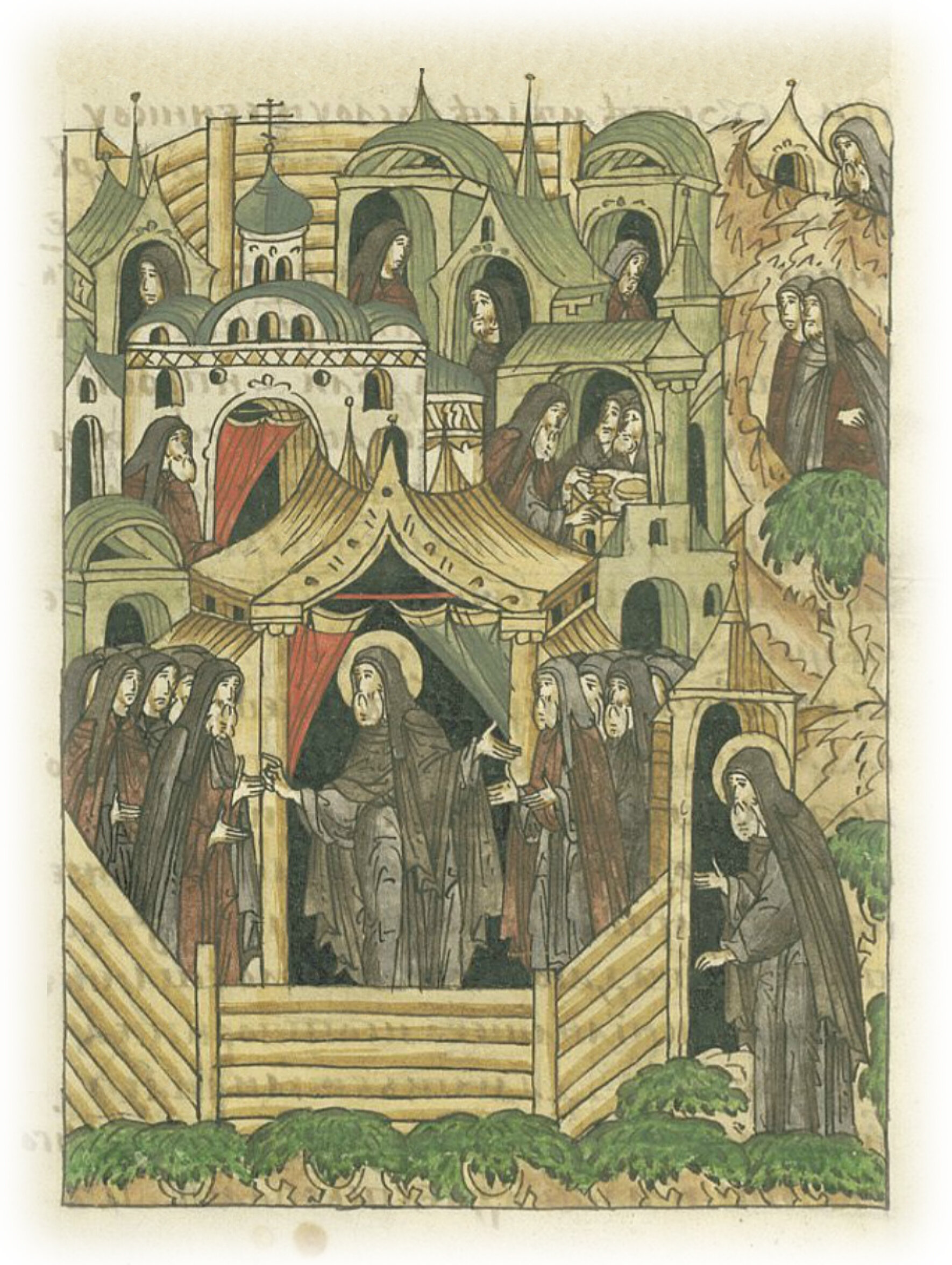 Повесть о преподобном Сергии Радонежском. Монахи преподобного Сергия радуются, что Царьградский патриарх Филофей благословляет сделать в монастыре общежительство. Преподобный игумен Сергий распределяет братию на службы.