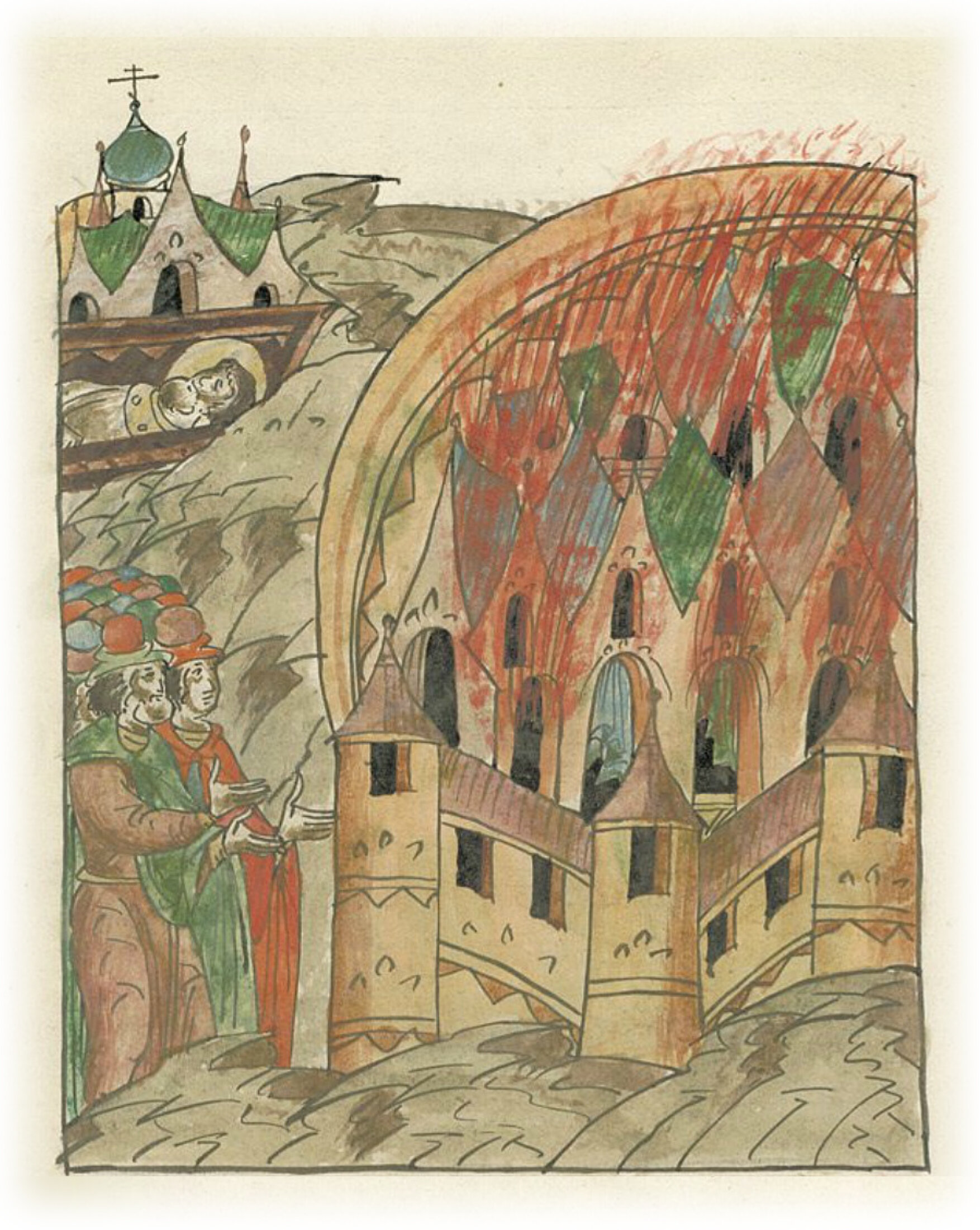 загорелся город их Великий, и сгорела его бóльшая половина, оставшаяся же часть города много дней загоралась по дважды и трижды на день; и так мало осталось от города, а все погорело, и многое множество бесчисленное товара сгорело. Содеялось же это над безбожными за пролитие крови Христова мученика Авраамия.