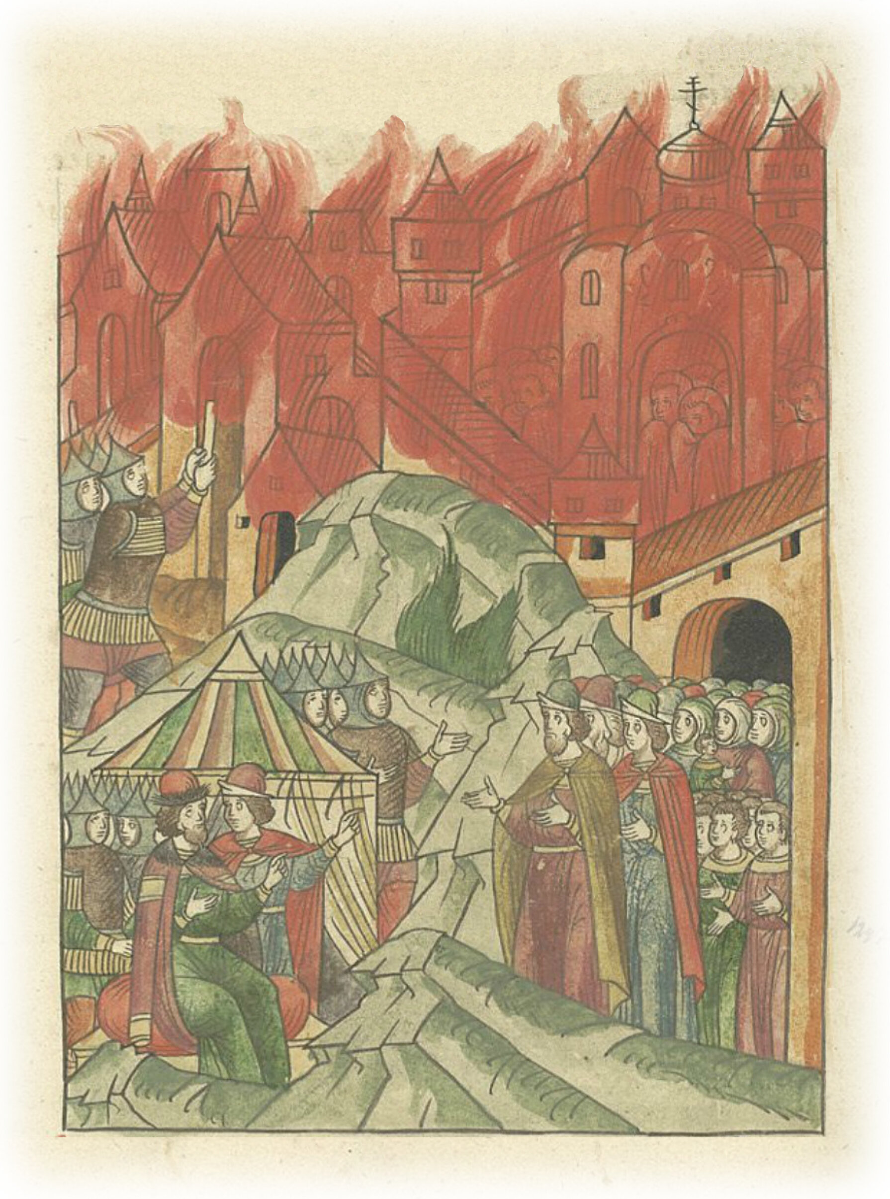 В Торжке загорается посад, и огонь распространяется по всему городу. Новоторжцы бегут из города в руки тверичам.