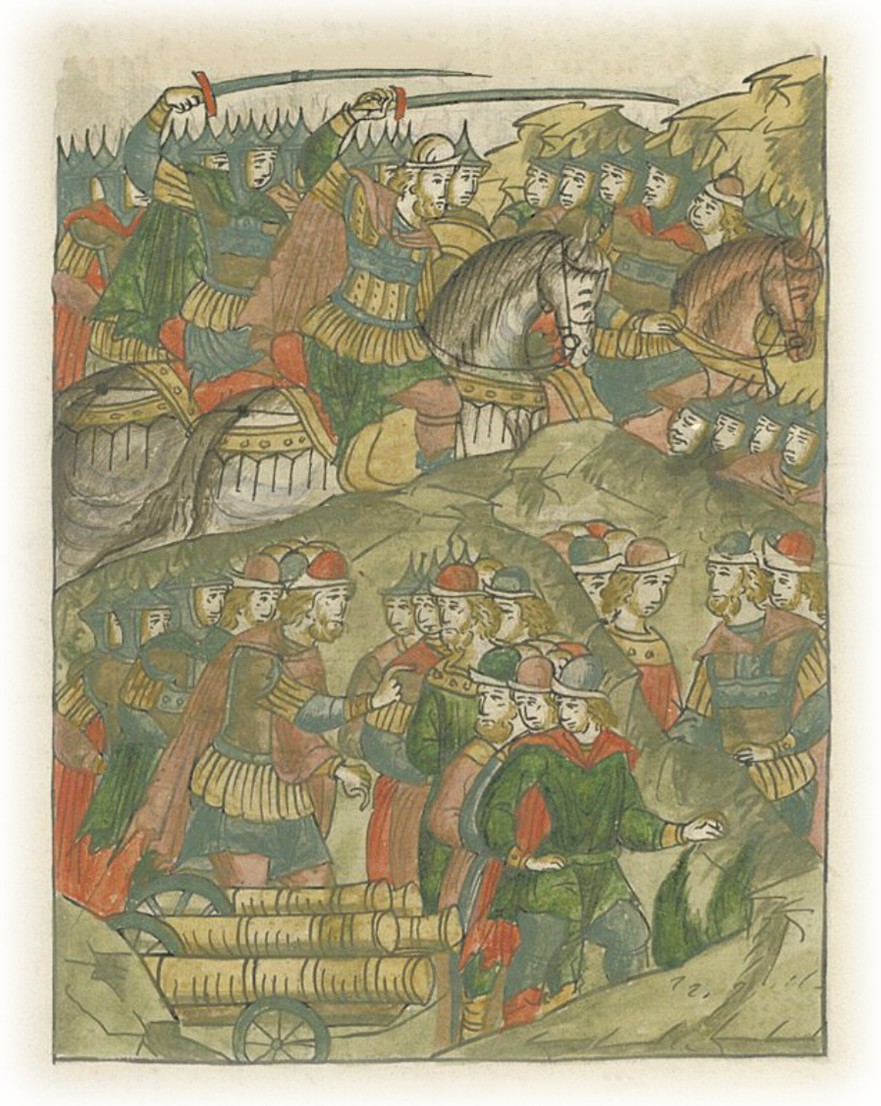 Языки говорят воеводам царя Ивана Васильевича, что магистр окопался большим рвом вокруг города Рындола, бьет из пушек и пищалей и приступает к Рындолу.