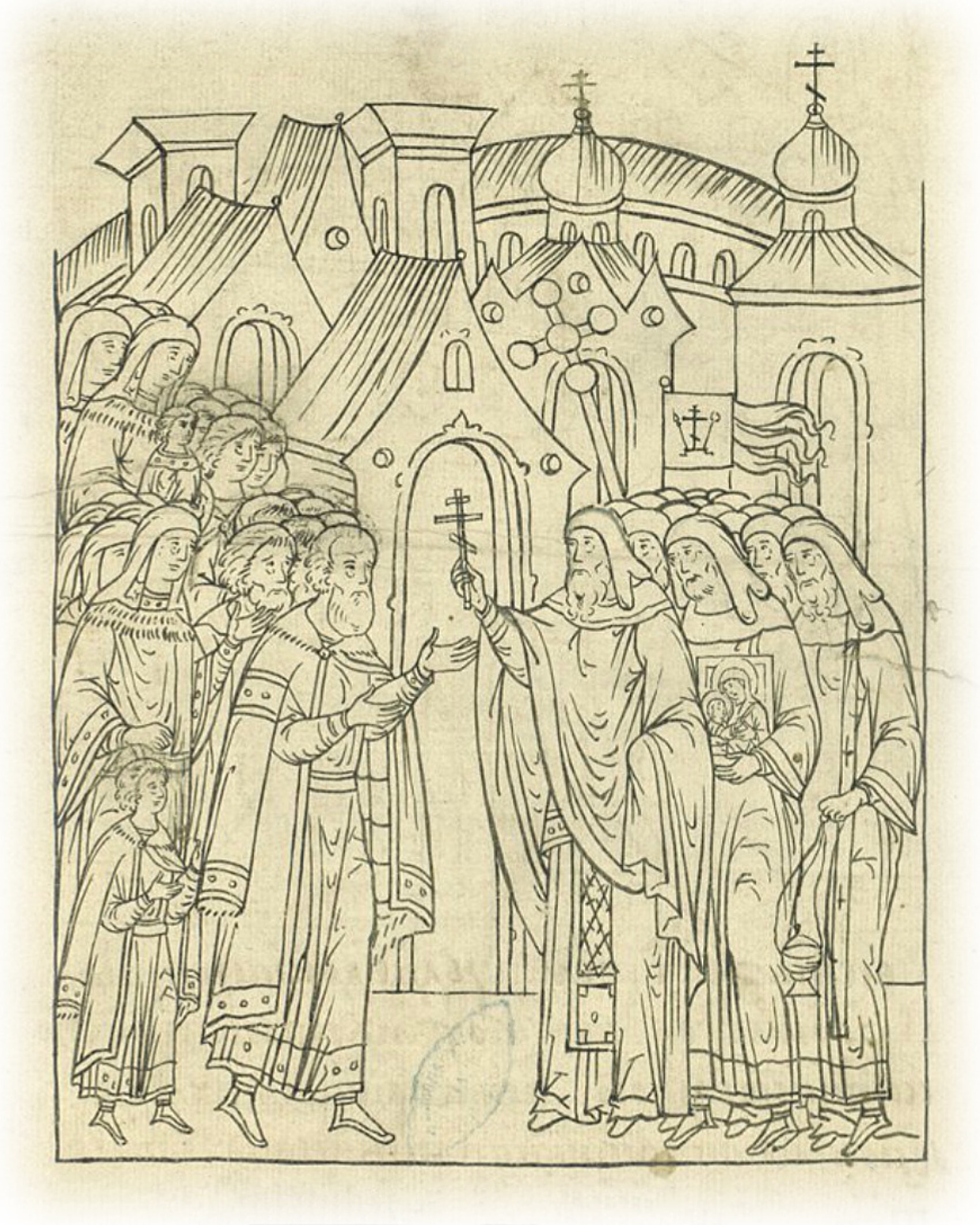 О поезде* великого князя к Троице в Сергиев монастырь. В 7042 (1533) году в сентябре в 22 день в воскресенье князь великий Василий Иванович всея Руси выехал из Москвы с великою княгинею Еленою и с детьми своими к Живоначальной Троице и к преподобному чудотворцу Сергию помолиться. Иприехал в монастырь к живоначальной Троице и к преподобному чудотворцу Сергию, и встретил великого князя игумен с братиею и со священниками и всеми клирошанами в воротах монастырских с иконами и кандилами. * поездом в XVI в. называлась торжественная поездка государя, выезд на войну летописи называют походом.