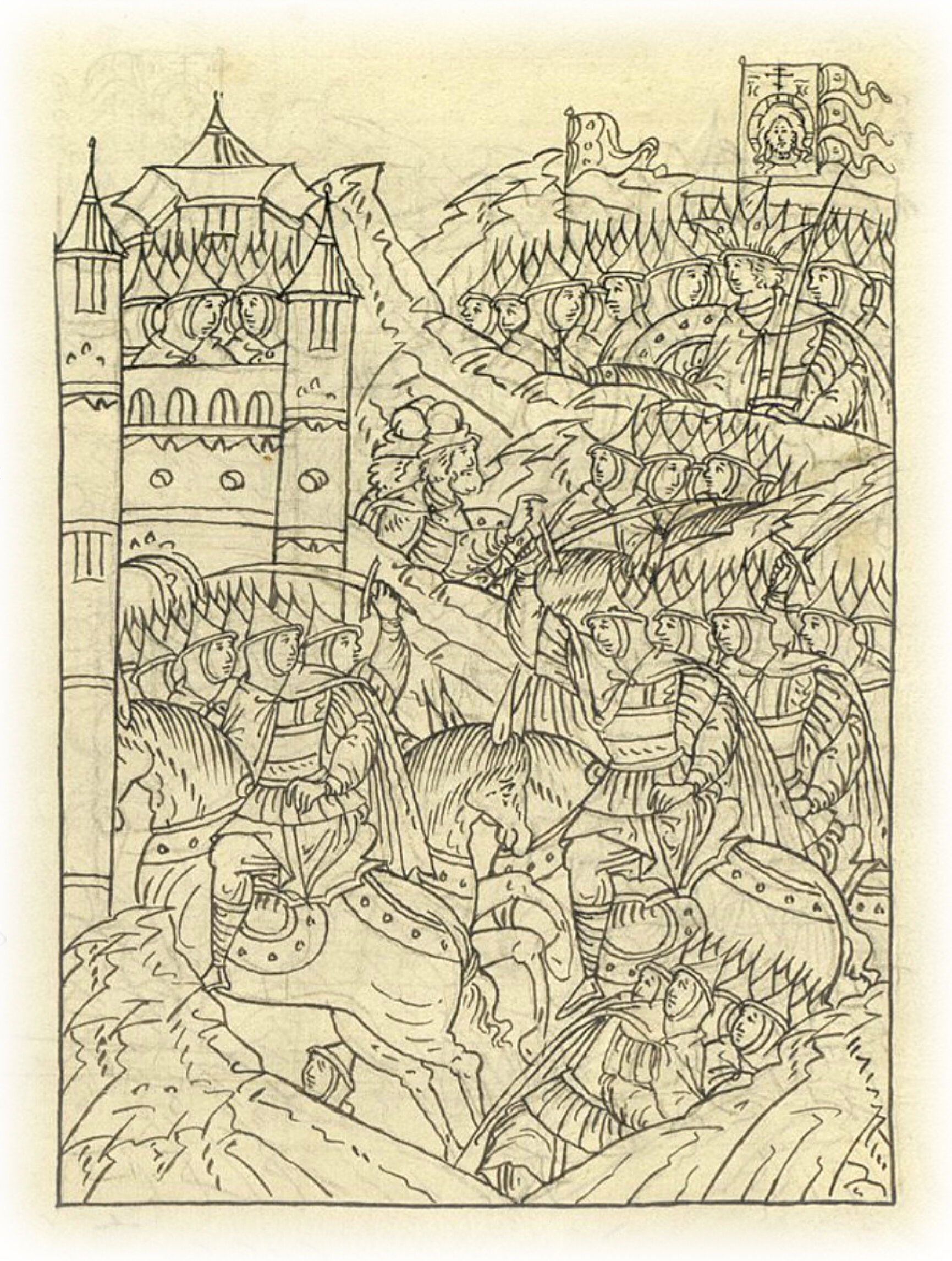 Языки говорят воеводам царя Ивана Васильевича, что магистр окопался большим рвом вокруг города Рындола, бьет из пушек и пищалей и приступает к Рындолу.