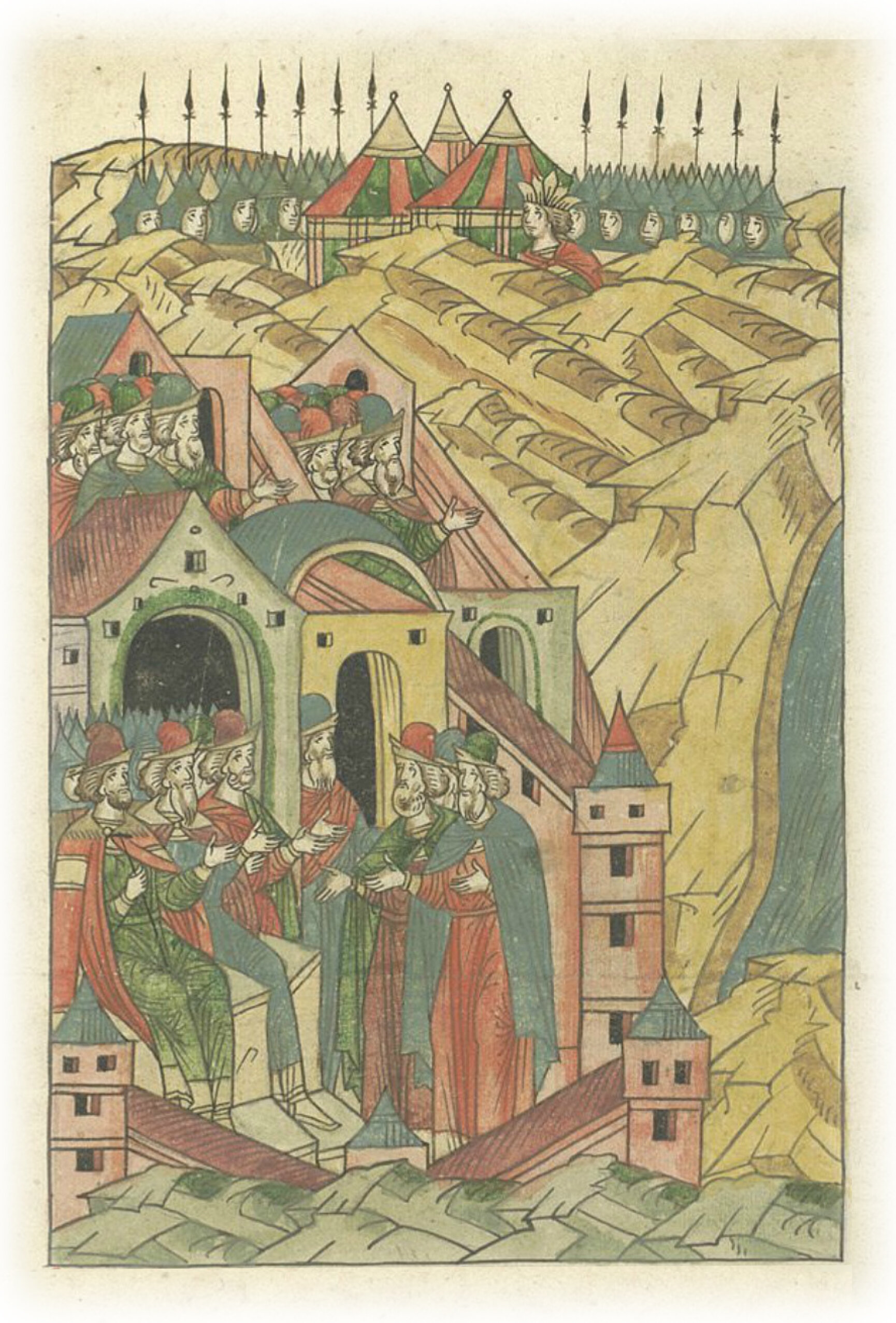 Языки говорят воеводам царя Ивана Васильевича, что магистр окопался большим рвом вокруг города Рындола, бьет из пушек и пищалей и приступает к Рындолу.