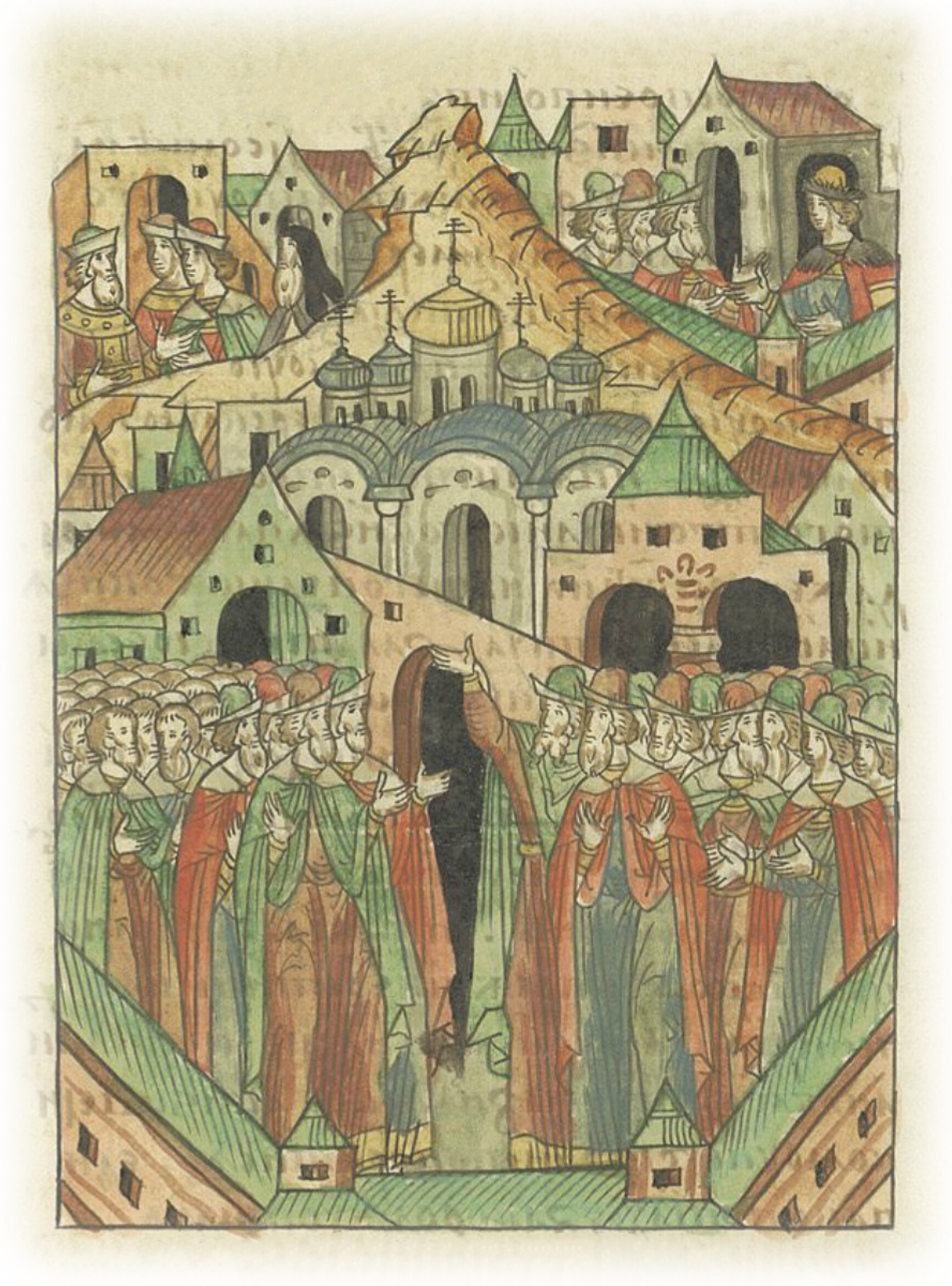 Многие же из них, старые посадники, тысяцкие, лучшие люди, а также и зажиточные горожане* говорили им: «Нельзя, братья, быть тому, как вы говорите: за короля нам даться и архиепископа поставить от его митрополита, латынина. Ведь мы изначала отчина тех великих князей, от первого великого князя нашего Рюрика, которого по своей воле взяла земля наша из варяг князем себе с двумя братьями его. Потом правнук его великий князь Владимир крестился и все земли наши крестил, и Русскую, и нашу Словенскую, Мерскую, Кривичскую весь, называемую Белозерской, муромскую, и вятичей, и прочих. И от того святого и великого князя Владимира даже и до сего господина нашего великого князя Ивана Васильевича за латинами не бывали и архиепископа от них не ставили себе, как ныне хотите ставить (архиепископа) от Григория, называющегося митрополитом Руси, ведь он ученик Исидора, по сути латынянин». Те же смутьяны, как и прежние еретики, наученные дьяволом, желая на своём поставить, и на благочестие дерзнувшие, князю великому не хотели покориться. Одни вопили: «За короля хотим!»; а другие кричали: «К Москве хотим, к великому князю Ивану и к отцу его митрополиту Филиппу православному!» * Люди, относящиеся к городским зажиточным сословиям, а также несущие службу при дворе князя или в уездных городах, боярские дети