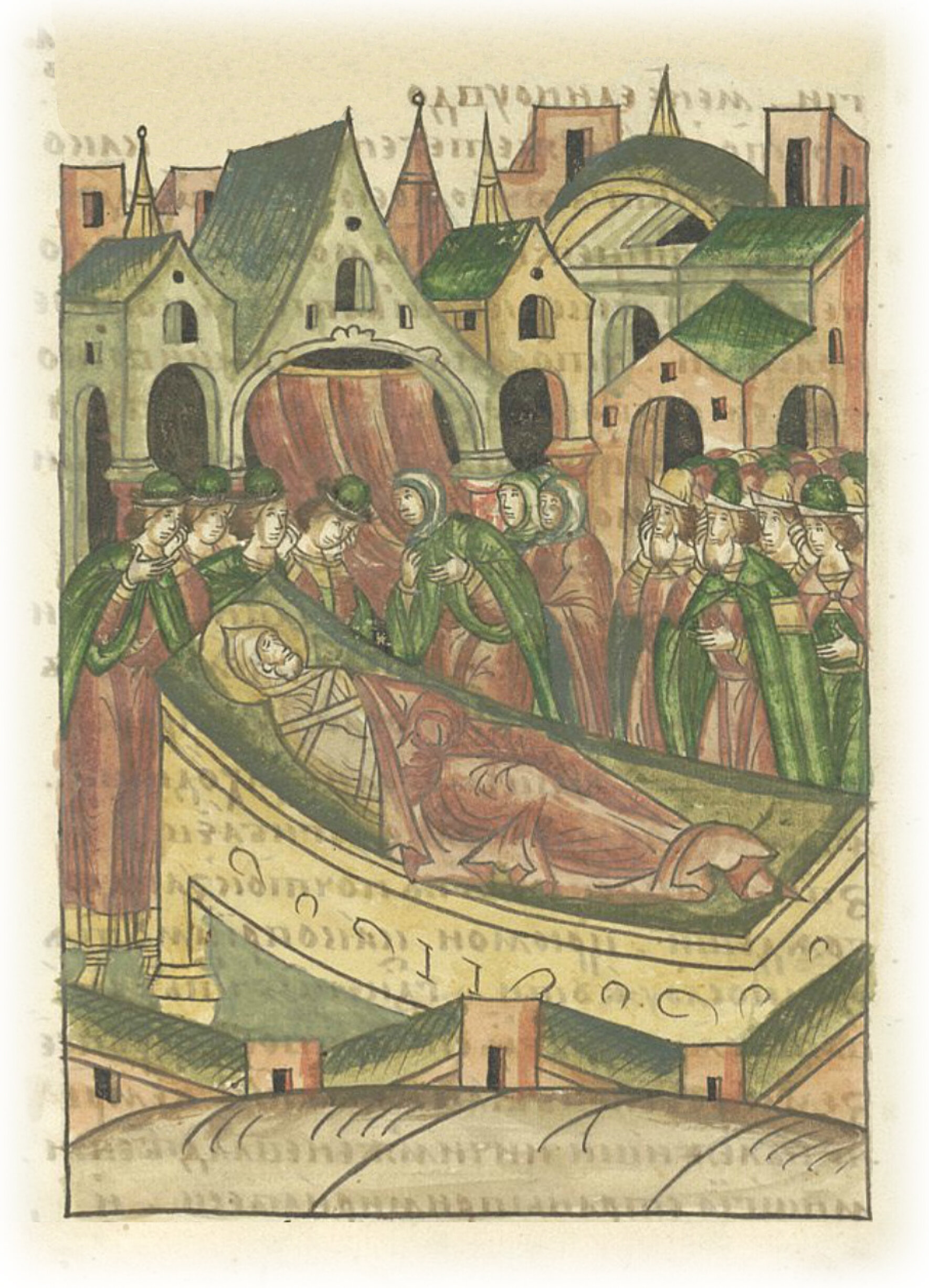 Княгиня же, увидев его лежащего мертвым на постели, горько зарыдала во весь голос, и горючие слезы полились из очей ее, сердечных муках она стала бить себя руками в грудь, и слова ее звучали как сладостный орган: «Зачем ты умер, жизнь моя, дорогой мой, меня вдовою оставив? Почему я не умерла прежде тебя? Погас свет очей моих. Где ты сейчас, сокровище жизни моей? Почему не поговоришь со мной, прекрасный свет очей моих? Почему так рано увял, виноград многоплодный? Уже не подашь плода сердцу моему и сладости души моей! Почему не посмотришь на меня, не промолвишь мне какого-нибудь слова? Ужели забыл меня? Почему не смотришь на меня и на детей своих, почему не отвечаешь им? На кого ты меня оставил? Солнце мое, рано ты зашло, месяц мой прекрасный, рано ты померк. Звезда восточная, зачем на запад уходишь? Царь мой, как могу теперь послужить тебе? Господин мой, где честь и слава твоя, где владычество твое? Государем всей земли Русской был ты, ныне же мертв лежишь, ничем не владеешь. Многие страны усмирил ты, много побед одержал, ныне же смертью побежден. Померкла слава твоя, и лицо твое скоро истлеет. Жизнь моя, больше не веселиться мне с тобой! Вместо драгоценного багрянца облекли тебя в простые бедные ризы, вместо царского венца простым платом тебе голову покрыли, вместо палаты прекрасной положат тебя в деревянный гроб. Свет мой ясный, зачем померк ты? Если Бог услышит молитву твою, помолись обо мне, княгине твоей. Вместе с тобой жила, с тобой и умереть хочу. И юность еще не оставила нас, и старость не настигла. На кого оставляешь меня и детей своих? Недолго радовалась я с тобой: за весельем пришли плач и слезы, а за утехой и радостью – сетование и плач. Почему не умерла я прежде тебя, чтобы не видеть смерти твоей и своей погибели! Слышишь ли, мой господин, слова мои печальные? Почему не сжалишься над моими горькими слезами! Звери в норы свои идут, птицы небесные к гнездам летят. Ты же, господин, из дома своего так внезапно уходишь. Кто я теперь? Осталась без своего царя. Старые вдовы – утешьте меня, молодые вдовы – плачьте со мной: вдовья доля – самая горькая. Мне остается плакать и восклицать: «Великий Боже, Царь Царям, будь мне заступником! Пречистая госпожа Богородица, не оставь меня и в печали не забудь меня!»