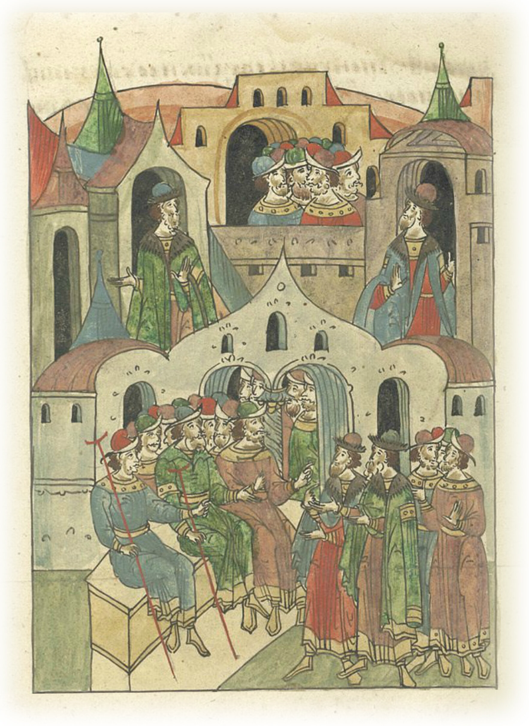 И сели князья на судище, и начали судить Михаила с Юрием, и все помогали Юрию, и многие вины возлагали на Михаила. Если что и отвечал Михаил, то мимо пропускали словеса его. А которые словеса и правдивыми были, но они все их презирали, прилежно же внимали словам Кавгадыя, ибо тот был и судья, и обвинитель, и на свою душу все брал, но заставлял верить себе всех. Потом разошлись, и их поставить повелели в следующую неделю на суде.