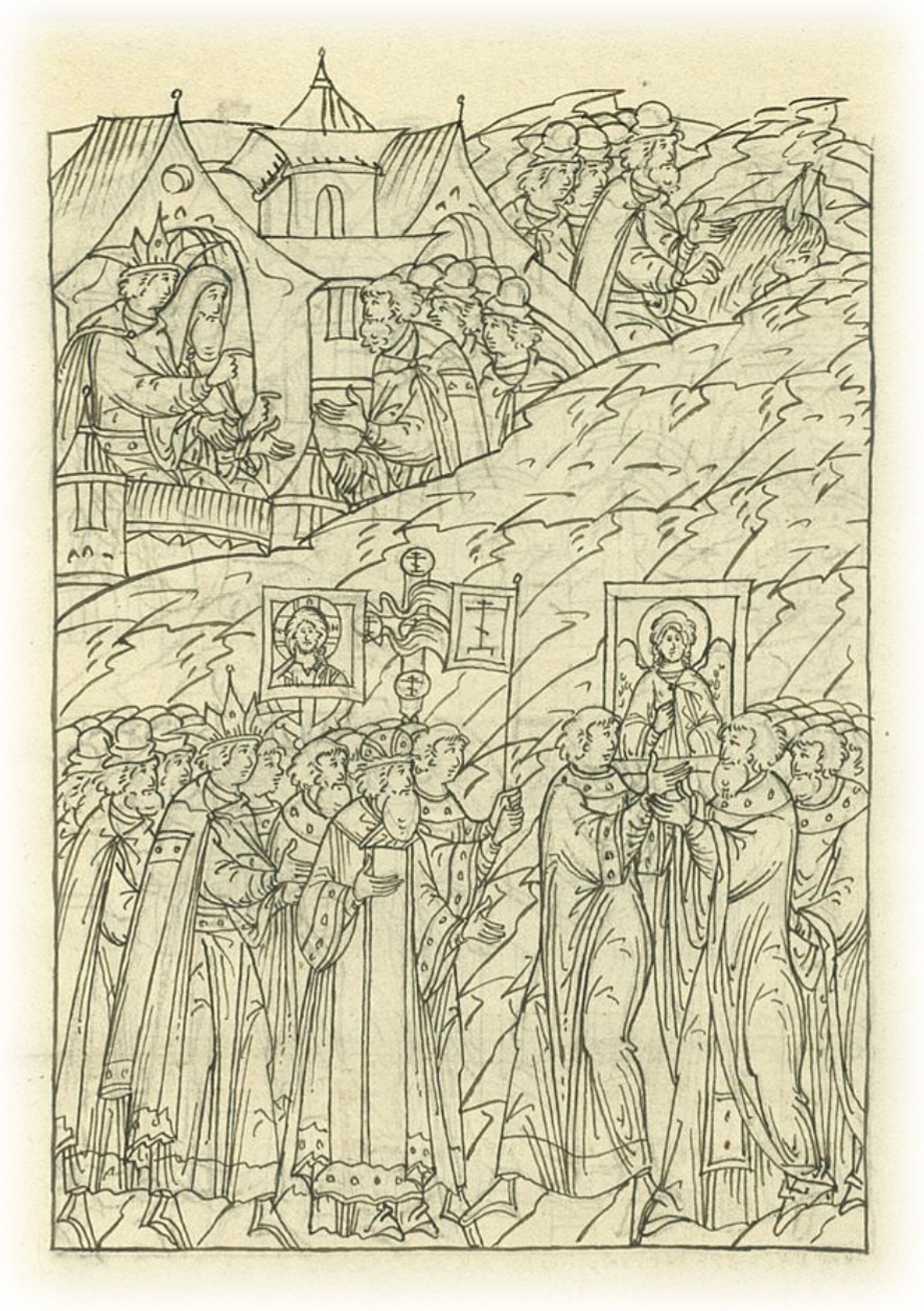 Царь Иван Васильевич и митрополит Макарий посылают священников за обретенной иконой архангела Михаила и встречают ее с честью.