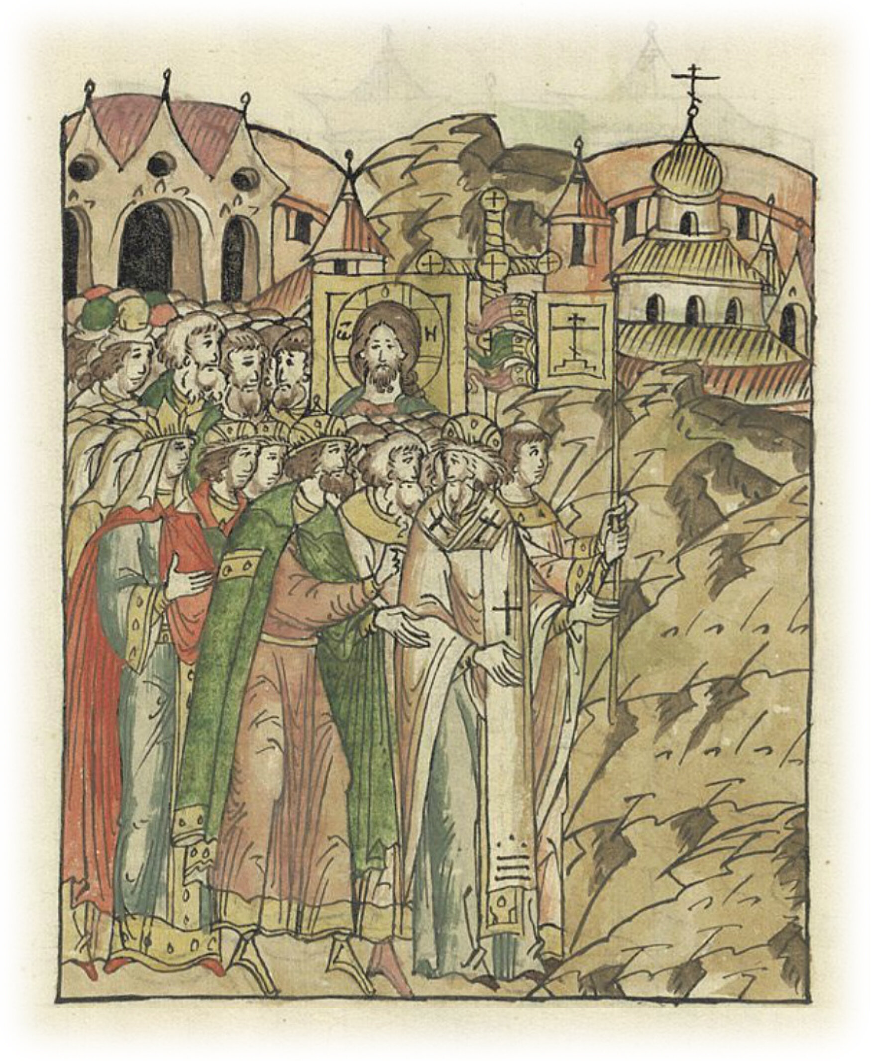 Наутро великий князь Константин повелел от соборной церкви святой Богородицы и от церкви святого Дмитрия идти с крестами епископу, всему клиру и всему народу; и сам пошел с княгиней, и с детьми, и с боярами в Вознесенский монастырь.