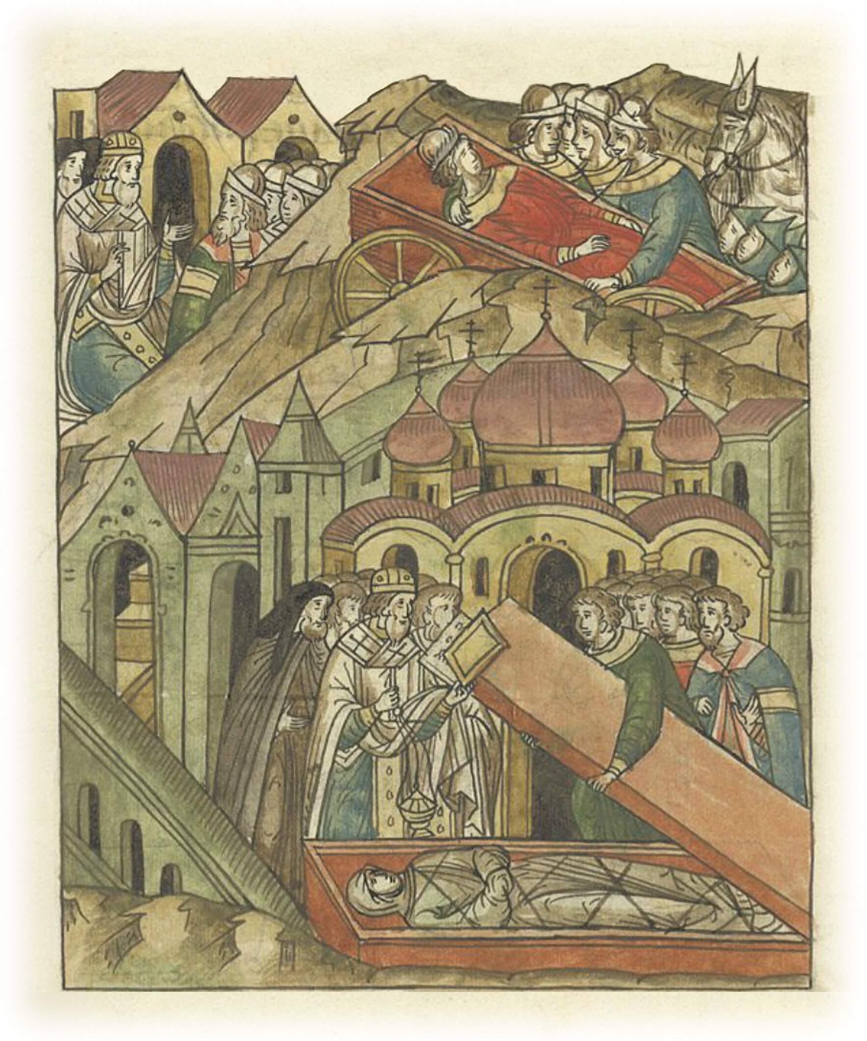 Блаженный же Кирилл, епископ Ростовский, послал взять тело его. И положили его в церкви пречистой Богородицы во Владимире.
