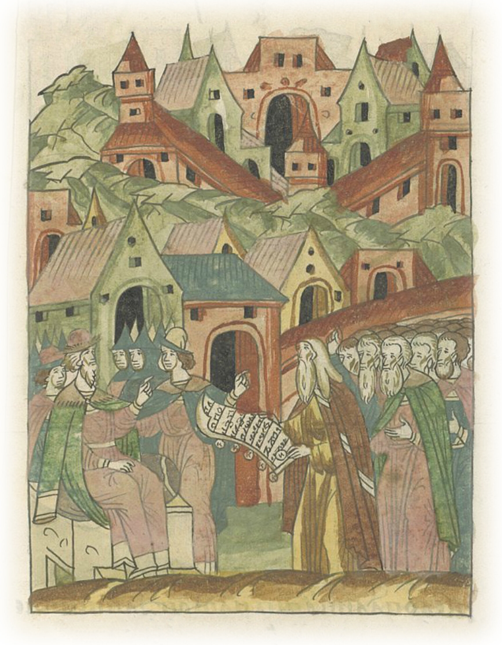 Владыка Феофил, новгородские, бояре, посадники, зажиточные горожане и купцы приходят к великому князю с целовальной записью.