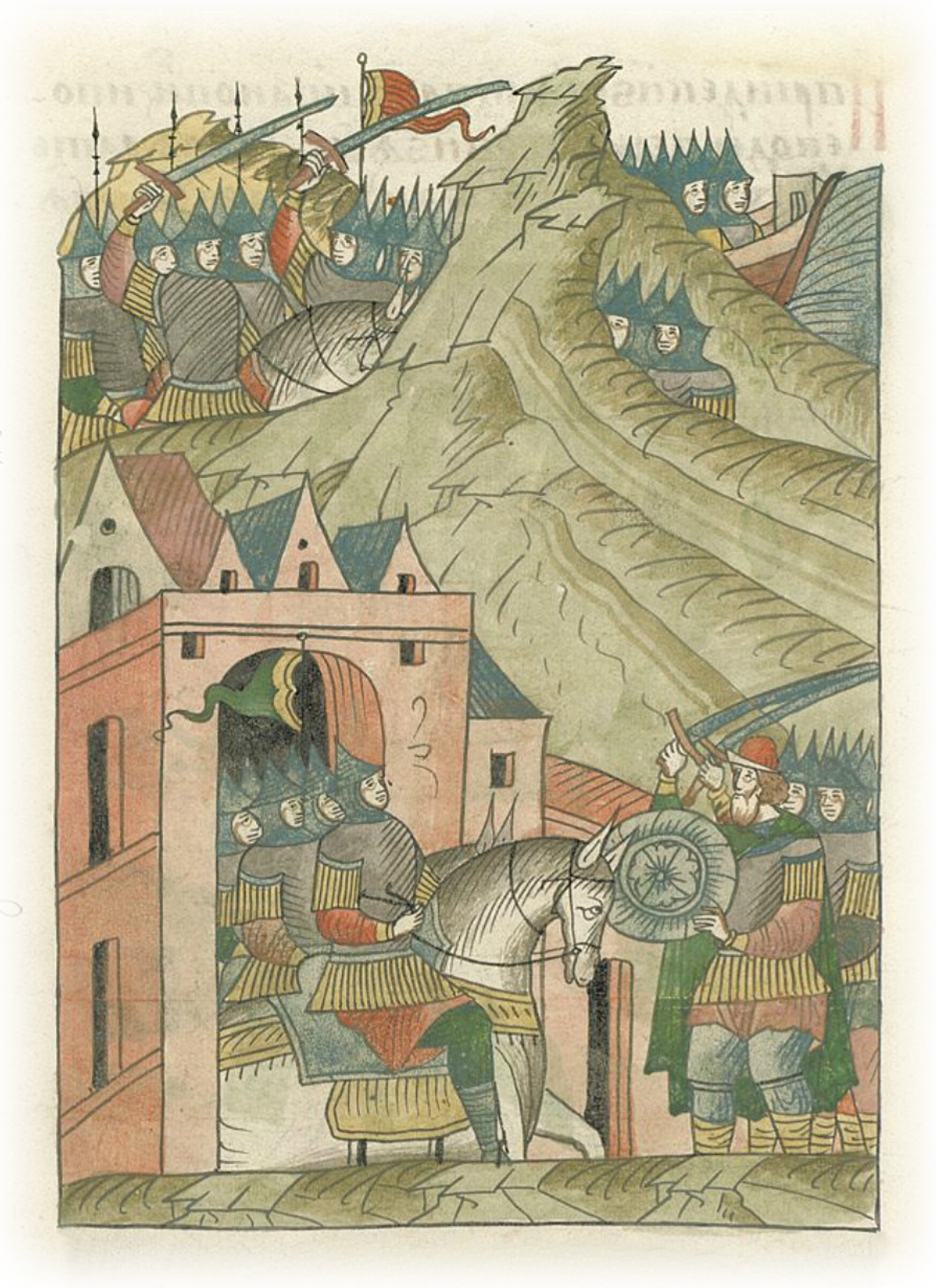 А татары из города вышли против них, а другие татары, скрываясь от судов, на конях наехали. И начался бой,