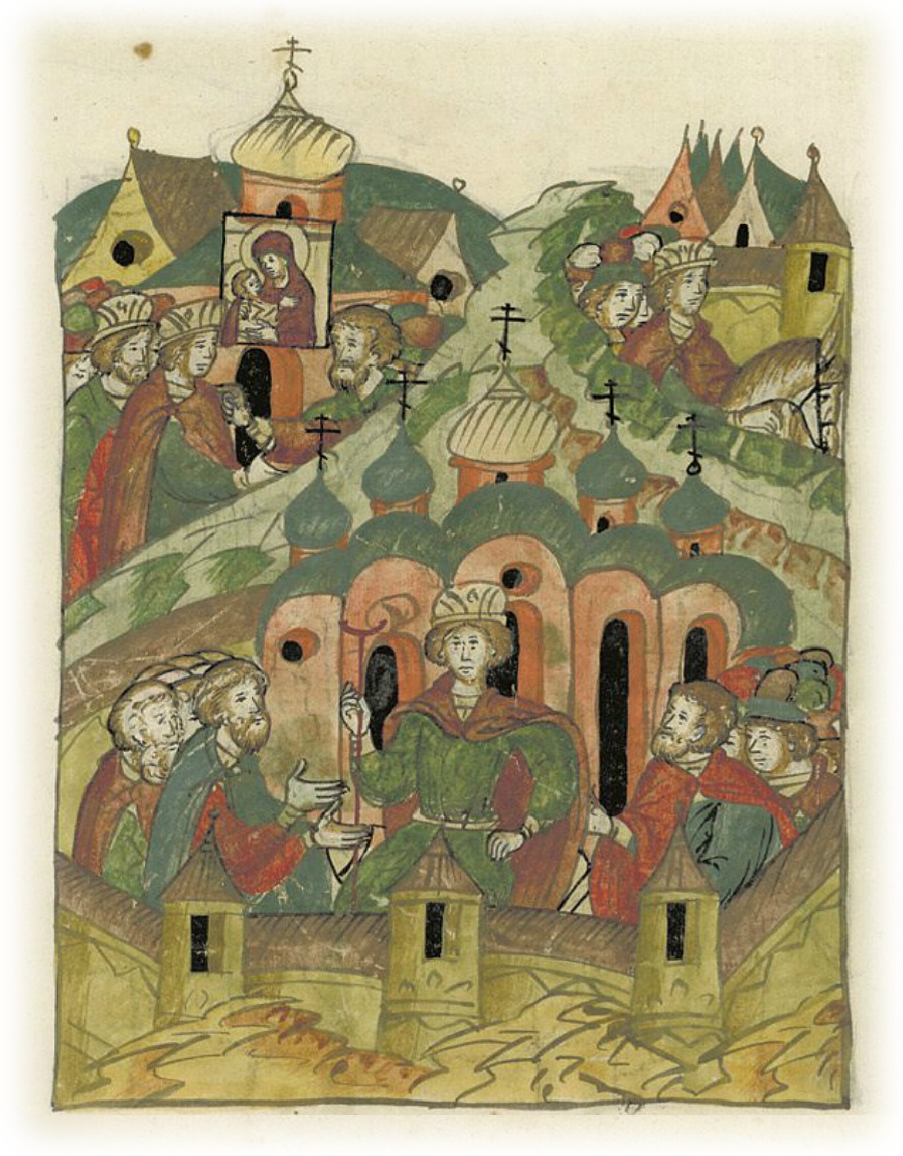 Новгородцы же взяли его от чудной Богородицы с великой радостью, и, придя в Новгород, возвели его на престол в святой Софии, и была великая радость в Новгороде.