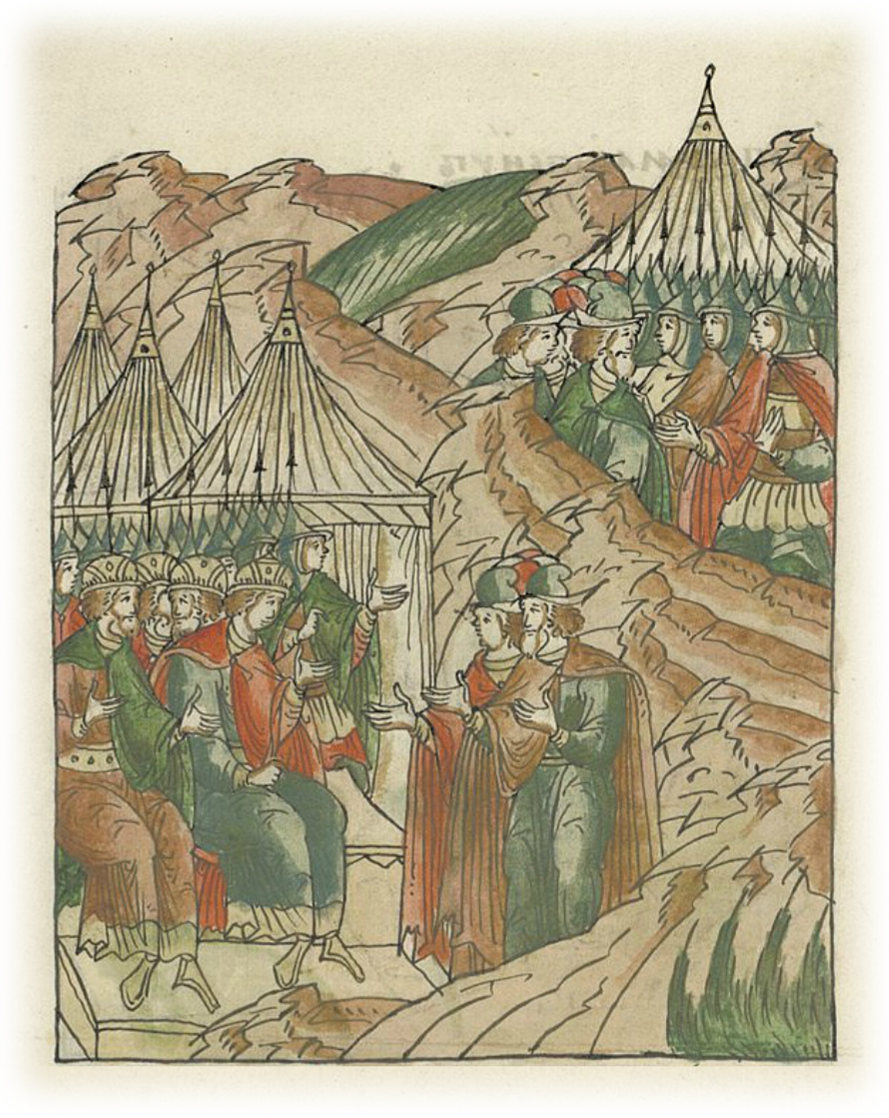 услышав об этом, татары послали к ним своих послов, говоря так: «Все мы люди, и все – из рода Адама. Зачем зря кровь свою проливаем, враждуем и бьемся; мы пришли не с вами воевать и вашего ничего не захватили, но пришли воевать со своими рабами половцами, потому что половцы исстари были нашими конюхами. Так почему же вы выступили против нас с войском и жаждете кровопролития; если хотите жить в благости, заключите с нами мир, а половцев от себя прогоните и не принимайте их».