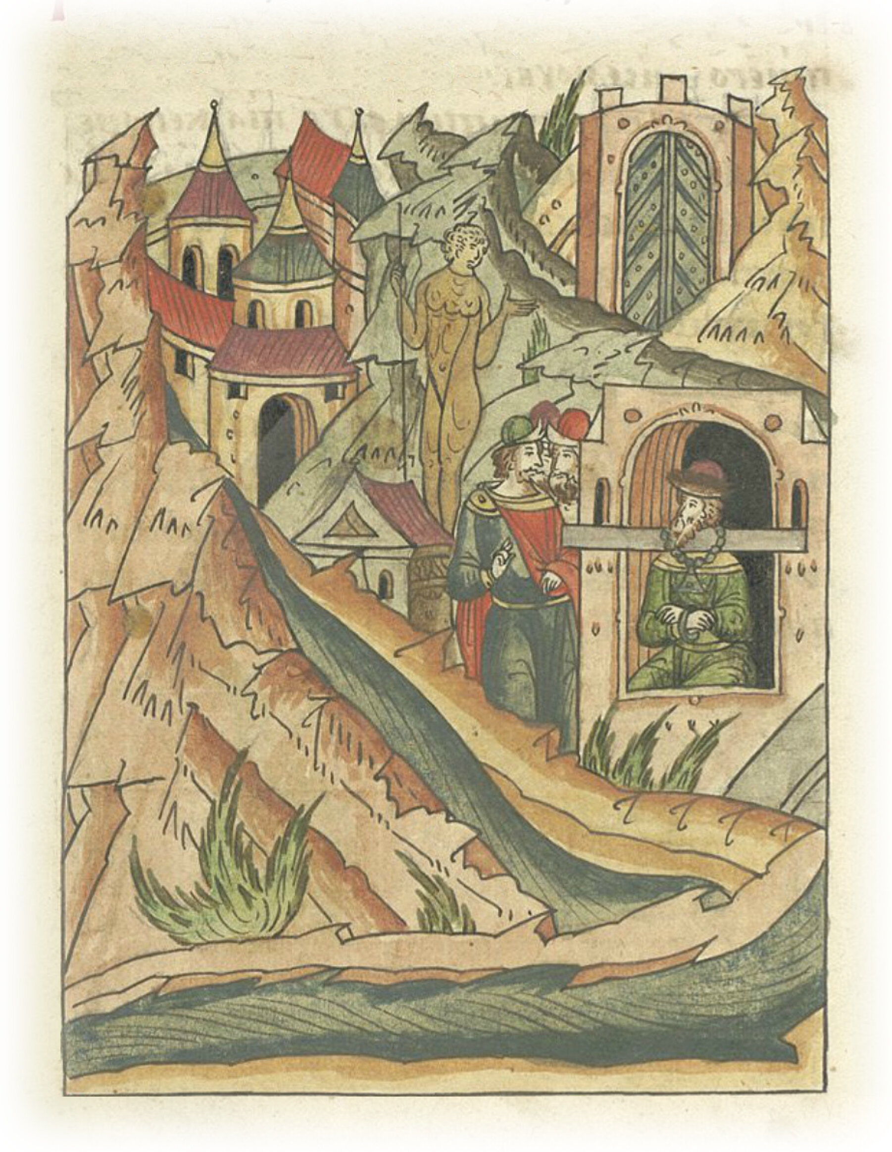И пребывал в той нужде двадцать шесть дней за рекою Теркою, под великими горами Ясскими и Черкасскими, у града Титякова, на реке Сивинце, близ врат железных, у болвана медного, у златой главы, у Темиревой богатырской могилы.