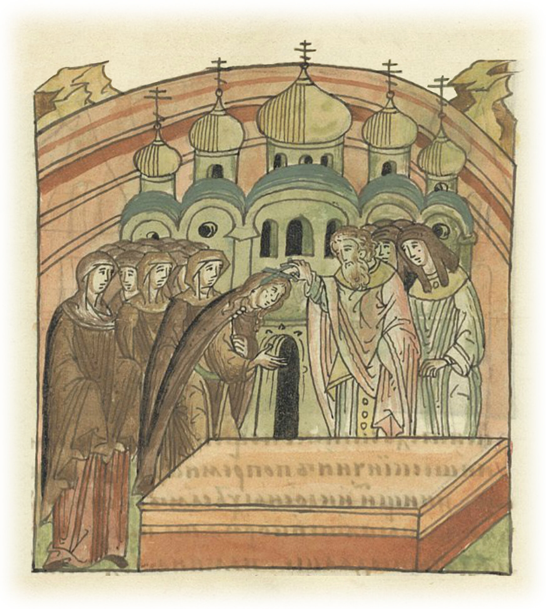 Княгиня Константина Всеволодовича постригается над гробом мужа с именем Агафья.