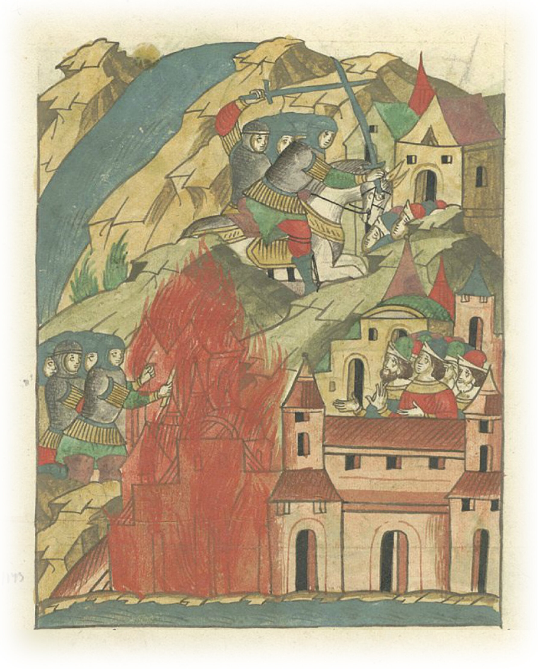 И, перейдя через реку Великую, пришли под стены города Пскова, сожгли посад, захватили и сожгли все села, но города не захватили. Не было в то время в городе ни князя Александра с посадником Пантелеем, ни других храбрых воинов.