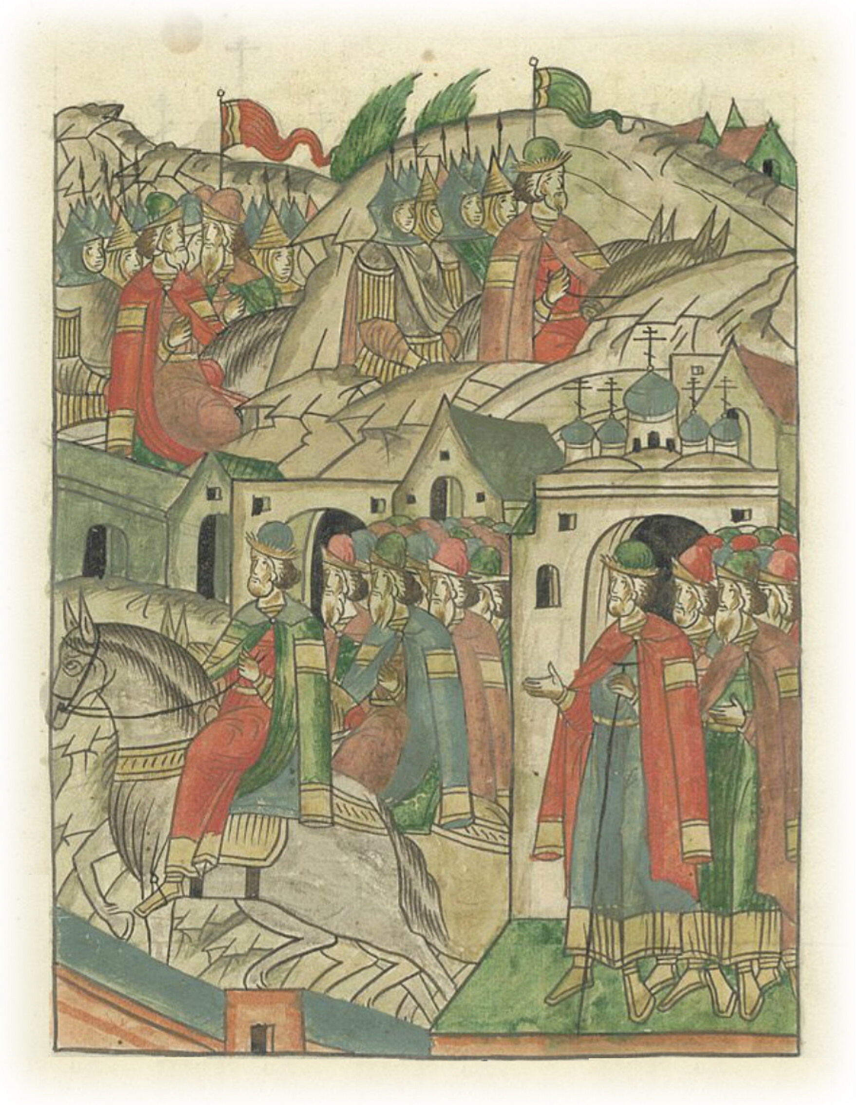 И вышел из церкви, и, сев на коня, пошел к Коломне. Брата же своего князя Владимира Андреевича отпустил на Брашеву дорогу, а белозерских князей – Болвановскою дорогою с воинством их.