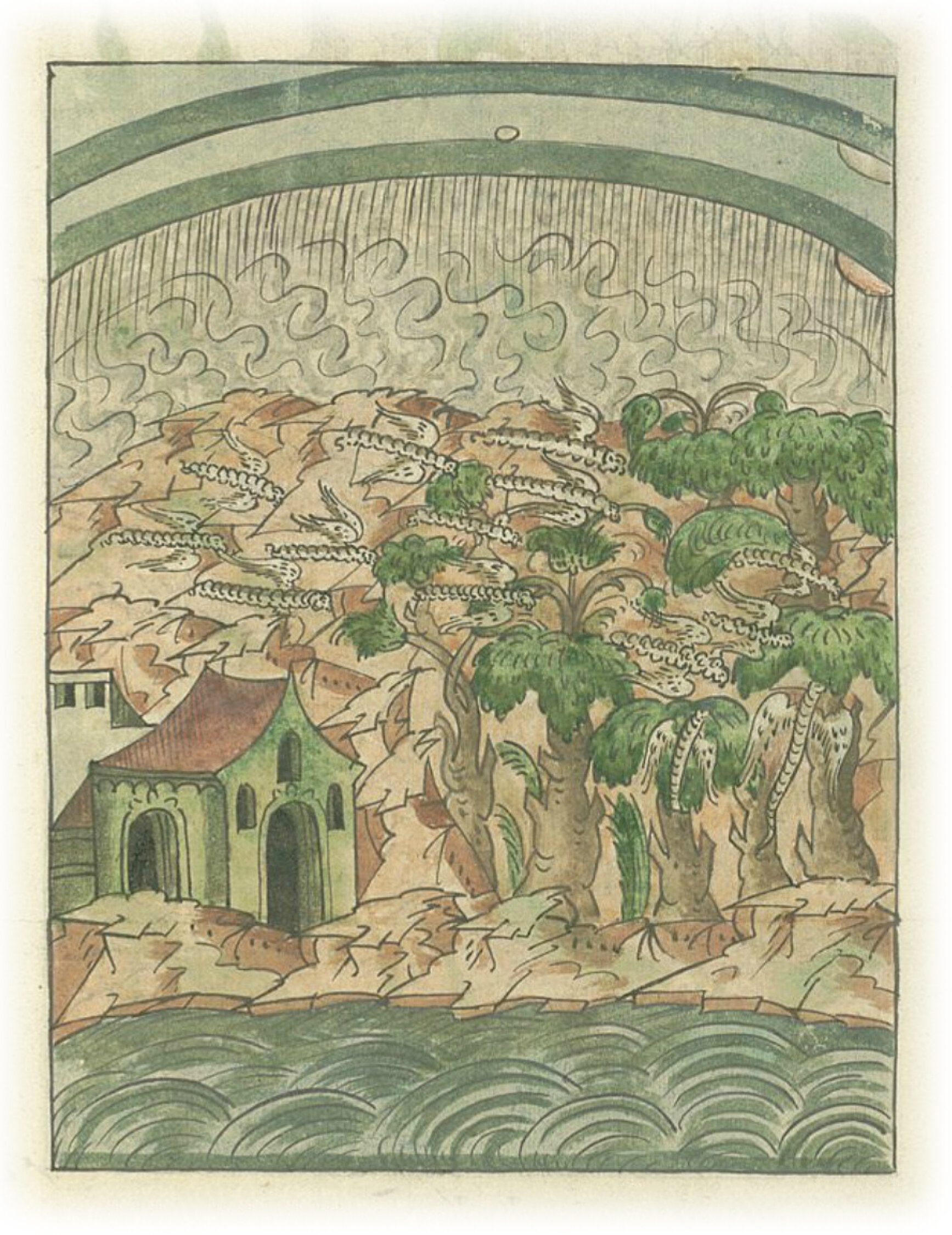 Знамение на месяце. Дожди и наводнения. Черви съедают все деревья, и они засыхают.