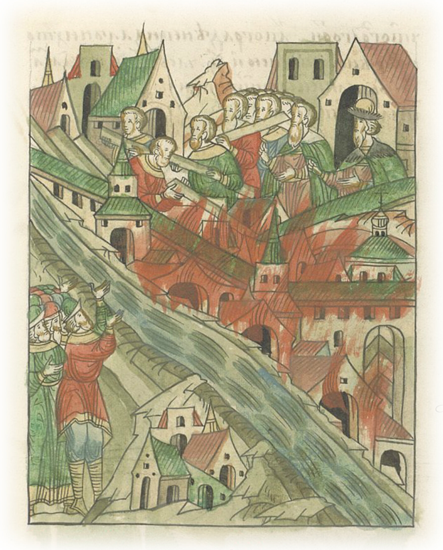 О пожаре московском. Месяца марта в 29 день в 6 часов ночи, с четверга на пятницу, загорелась Москва внутри города близ церкви Петра чудотворца, что на Угрешском дворе, так как были поварни за городом под городской стеной, и загорелись поварни те, и оттого кровля на стене загорелась, также и хоромы, которые в городе, а люди все спали; и начали из Заречья кричать, что город горит, а в городе не видал никто. И горело всю ту ночь и 4 часа дня, пока сам князь великий со многими людьми не переметали и угасили.