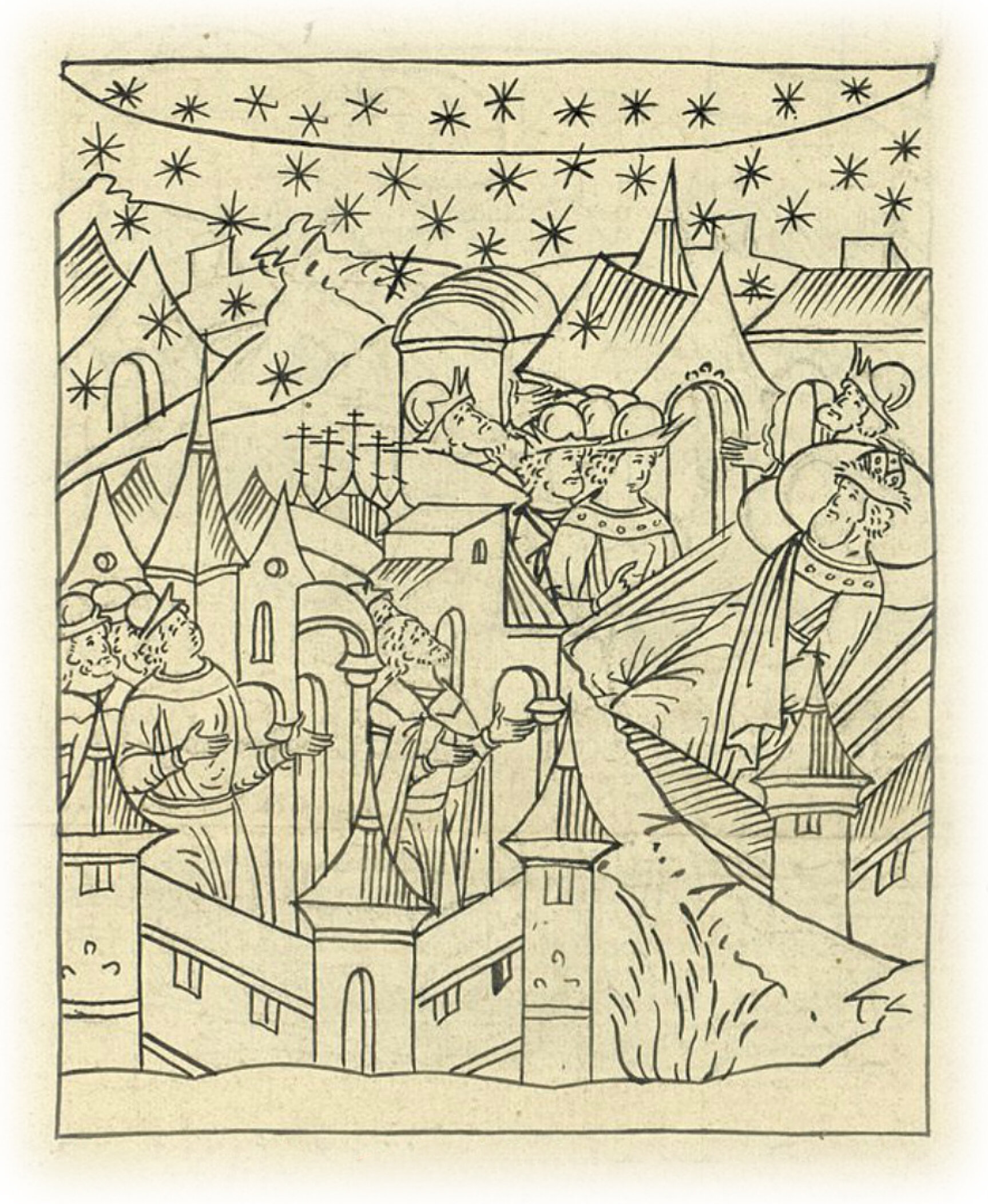 О знамении. Было же в ночи с пятницы на Дмитриеву субботу знамение на небесах: падало множество звезд, будто великие градовые или дождевые тучи проливались на землю; и видели то знамение с небес множество людей на Москве и на Волоке, и во всех владениях земли Русской.