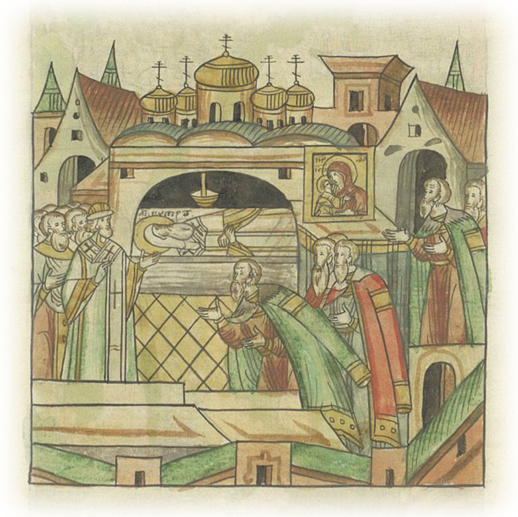 также и перед чудотворным образом (Пречистой), который сам чудотворец Петр написал. Потом же приходит к гробу святого отца нашего чудотворца Петра митрополита, совершая молебен и слезы изливая, прося помощи и защиты у них, а также и у прочих святителей, в той церкви лежащих: преосвященных митрополитов Феогноста, Киприана, Фотия и Ионы.