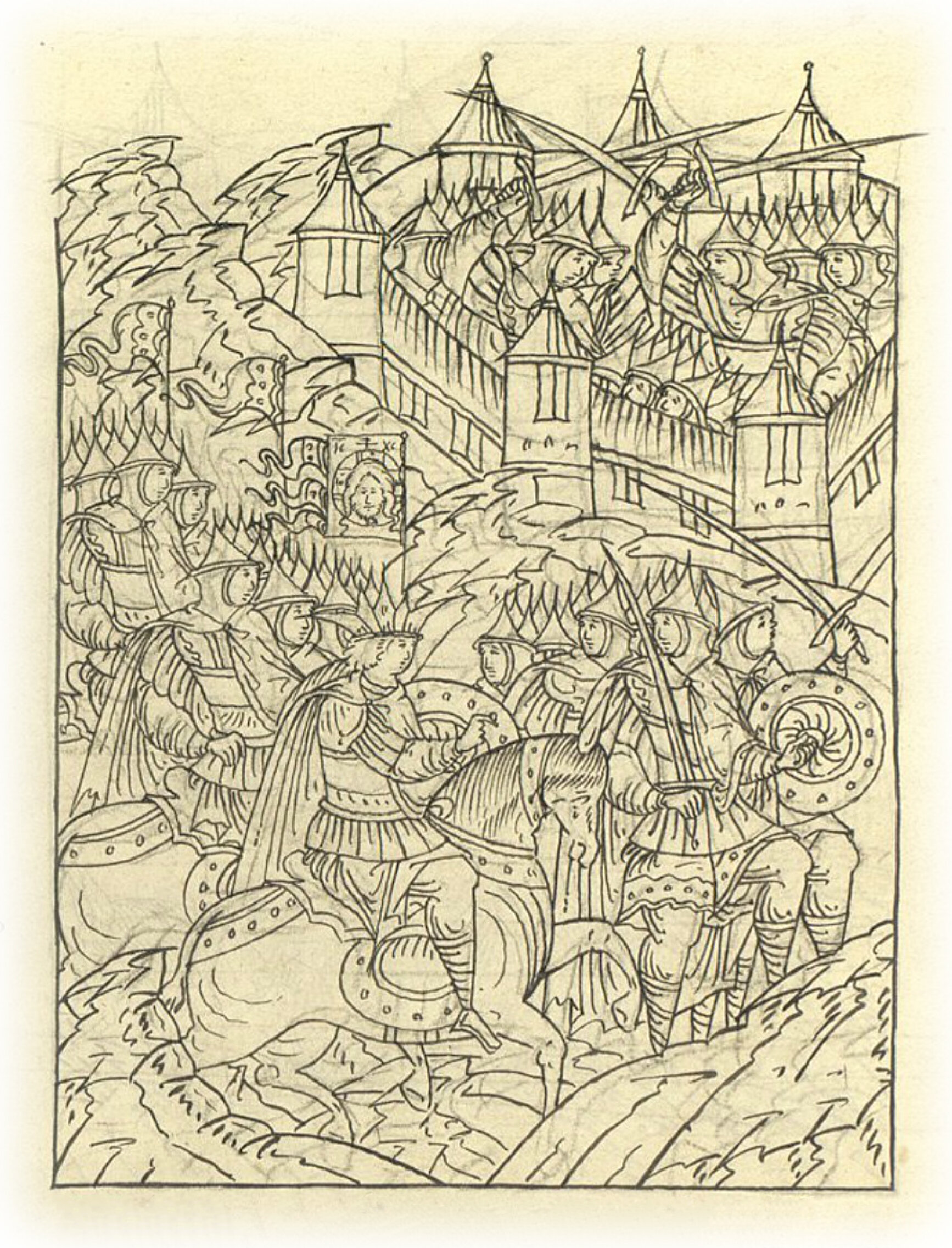 Царь посылает голов своего царского полка и велит сойти с коней и помогать своим, ибо на конях невозможно: теснота в городе великая между домами, а также и от множества людей.