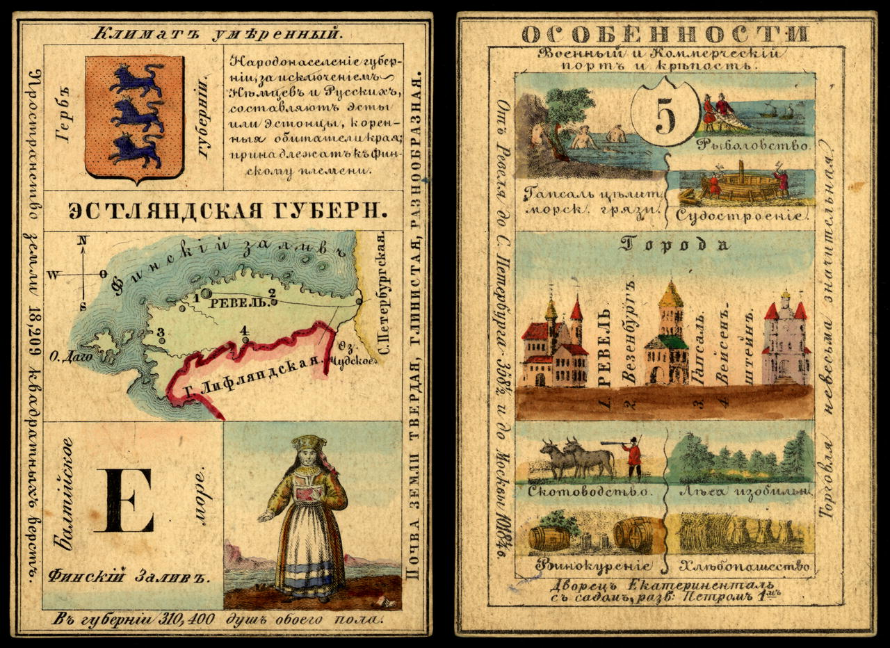 Эстляндская губерния — самая северная из трех губерний Прибалтийского края, тянется полосой с востока к западу вдоль южного берега Финского залива и заканчивается архипелагом островов. Крайние точки Э. губернии: на западе — мыс Дагерорт (Каланинна) на острове Даго (20°2' восточной долготы), на востоке — река Нарова (близ города Нарвы, 28°12' восточной долготы), на севере — скалистый мыс Стенскер на берегу Финского залива (59°49' северной широты), на юге — остров Керксар у Перновского залива (58°19' северной широты). На западе материковая часть Э. губернии граничит Балтийским морем (297 верст), на севере — Финским заливом (469 верст), на востоке — рекой Наровой, которой отделяется от С.-Петербургской губернии (75 верст), на юге — озером Чудским или Пейпусом и Лифляндской губернией (371 верста); более 2/3 пограничной линии приходится на долю водных (не считая островов) и около 1/3 — сухопутных границ.