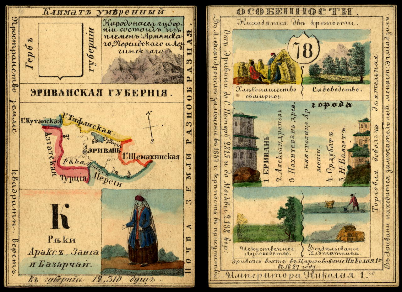 Эриванская губерния была образована в июле 1849 года из Армянской области, с присоединением Александропольского уезда. С 1872 г. губерния состоит из 7 уездов. Важнейшие населённые пункты, кроме Эривани, — Александрополь, Нахичевань, Ново-Баязет, Ордубад и Эчмиадзин. Эриванская губерния расположена в центральной части южного Закавказья, между 41°7' и 38°52' с.ш. и 60°56' и 63°54' в.д., образует неправильный, вытянутый с северо-запада на юго-восток параллелограмм; граничит: на севере — с Тифлисской и Елизаветпольской губерниями, на востоке — с Елизаветпольской губернией, на западе — с Карсской областью, на юге — с Эрзерумским вилайетом Азиатской Турции и с Персией.