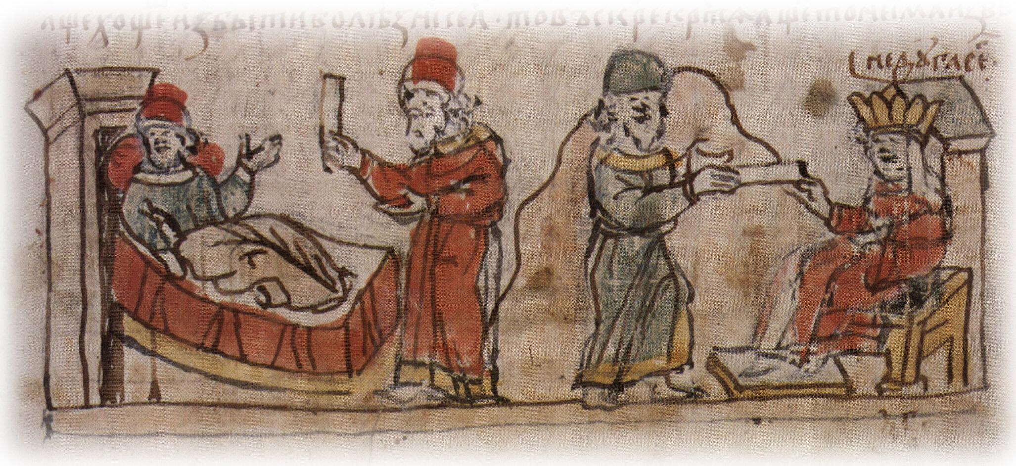 Тайное погребение Владимира Святославича, умершего в Берестове: спуск его тела на землю на ковре между разобранными клетьми здания; положение тела Владимира в мраморный гроб в церкви Святой Богородицы.