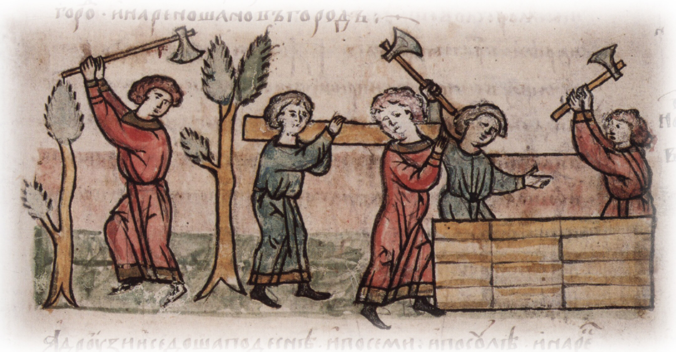 "Словене же седоша около озера Ильменя, и прозвашася своим именем, и соделаша город, и нарекоша Новгород". Справа подпись к рисунку: "Новгородъ велик".