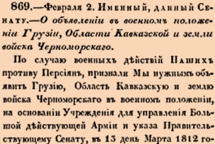 869. 1827 год. 14 февраля (2 февраля ст.ст.) Именный, данный Сенату. О объявлении в военном положении Грузии, Области Кавказской и земли войска Черноморскаго.По случаю военных действий Наших противу Персиян, признали Мы нужным объявить Грузию, Область Кавказскую и землю войска Черноморскаго в военном положении