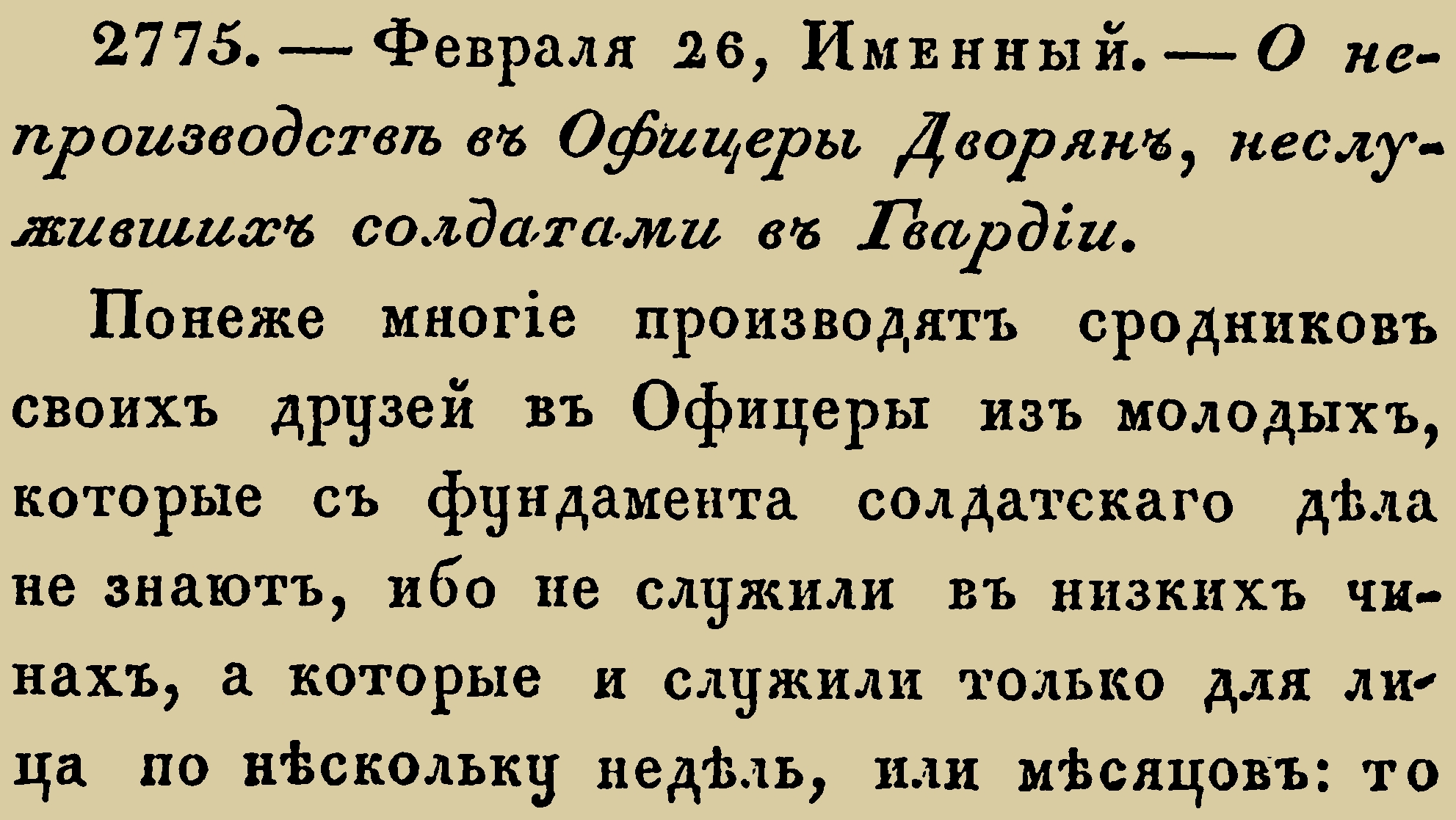 Закон № 2775. — 1714 год 26 февраля (9 марта). Указ о запрете производства в офицеры дворян, не прошедших действительную солдатскую службу в гвардейских полках.