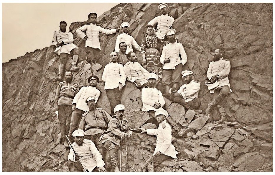 1. Генерал-майор, М. Е. Ионов; 2, 3. Капитан А. Г. Скерский с супругой; 4. Инженер А.Г. Серебренников; 5. Начальник штаба объединенных отрядов Генштаба подполковник Н. Н. Юденич; 6. Капитан В. Н. Зайцев и другие чины отрядов.