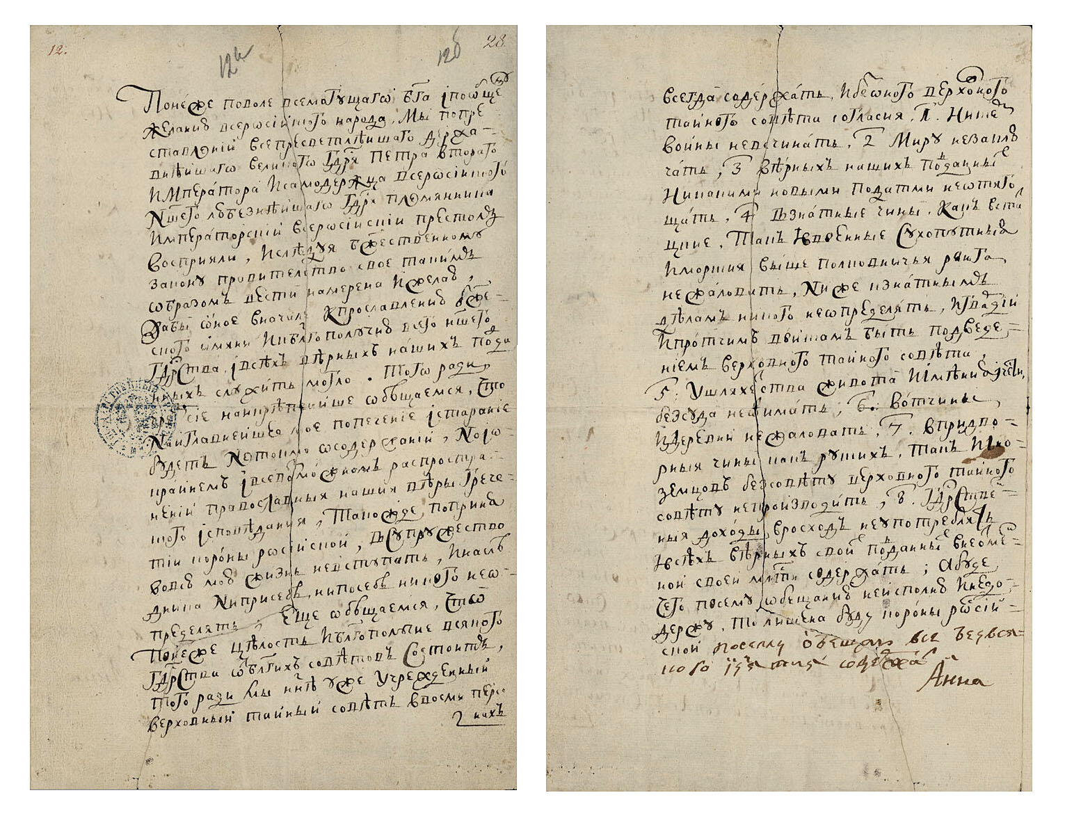 Двойной лист, писарский почерк, разорван сверху вниз наискось. Последние полторы строки и подпись — автограф Анны Иоанновны.