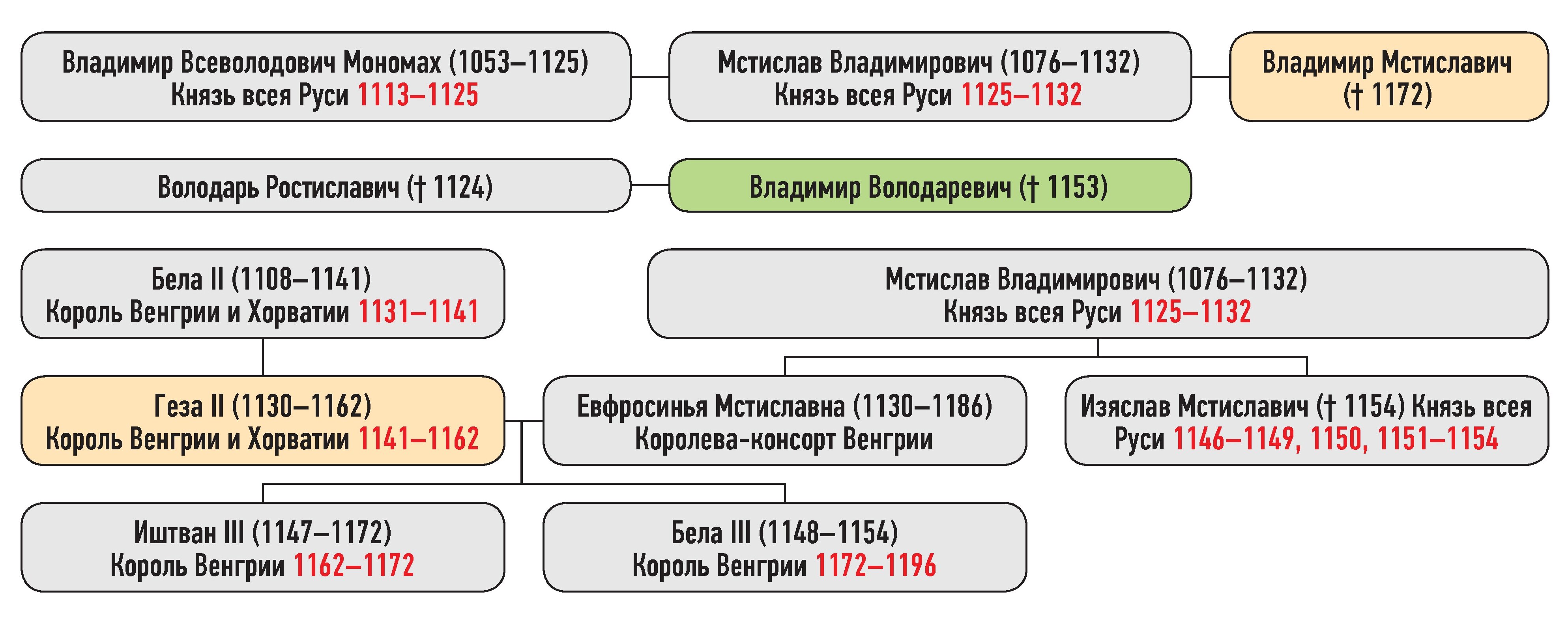 Генеалогическая схема к усобице Владимира Мстиславича и Владимира Володаревича осенью 1150 г.