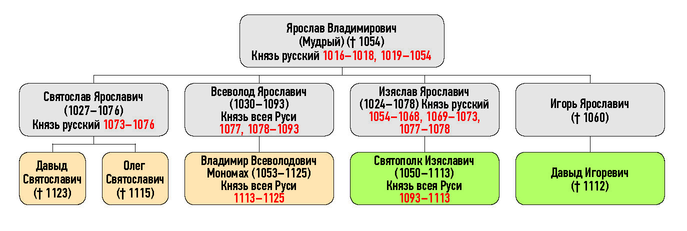 Ярослав Владимирович (Мудрый) († 1054), Святослав Ярославич (1027–1076), Всеволод Ярославич (1030–1093), Изяслав Ярославич (1024–1078) Князь русский, Игорь Ярославич († 1060), Святополк Изяславич (1050–1113) Князь всея Руси, Давыд Игоревич († 1112), Владимир Всеволодович Мономах (1053–1125) Князь всея Руси, Олег Святославич († 1115), Давыд Святославич († 1123)