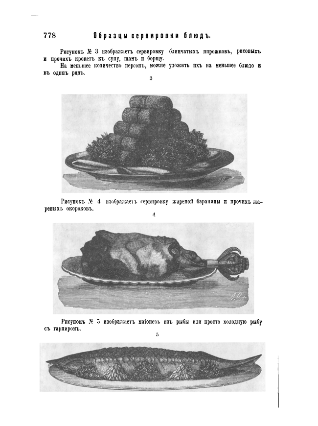 Образцы сервировки блюд. Рисунок №3. Сервировка блинчатых пирожков. Рисунок №4. Сервировка жареной баранины и прочих жареных окороков. Рисунок №5. Майонез из рыбы или просто холодная рыба с гарниром.