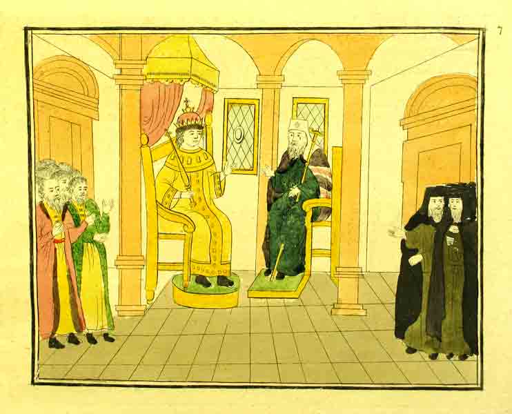 Михаил Федорович испрашивает совета у отца, святейшего патриарха Филарета о браке. Гравюра, акварель. 1810 год. По оригиналу последней трети XVII в.