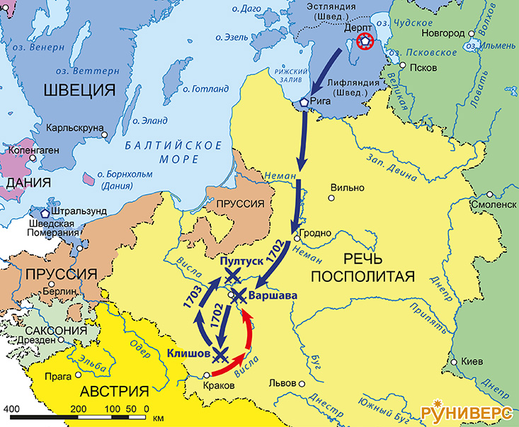 Северная война 1700-1721. Карта кампаний 1701–1704 гг. Действия в Лифляндии и Польше