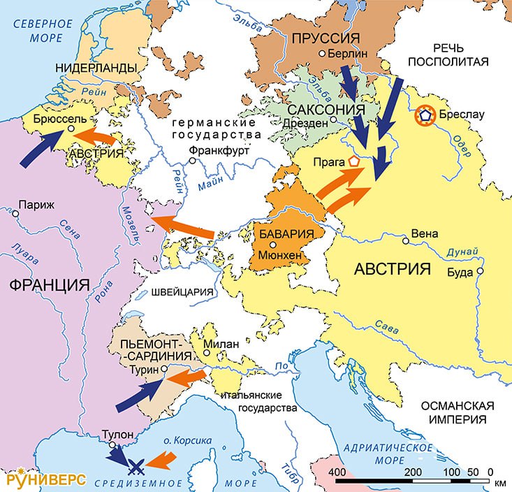 Война за австрийское наследство 1740–1748 гг. Карта кампаний 1744 г. в Центральной Европе.