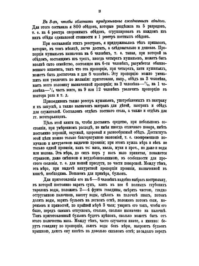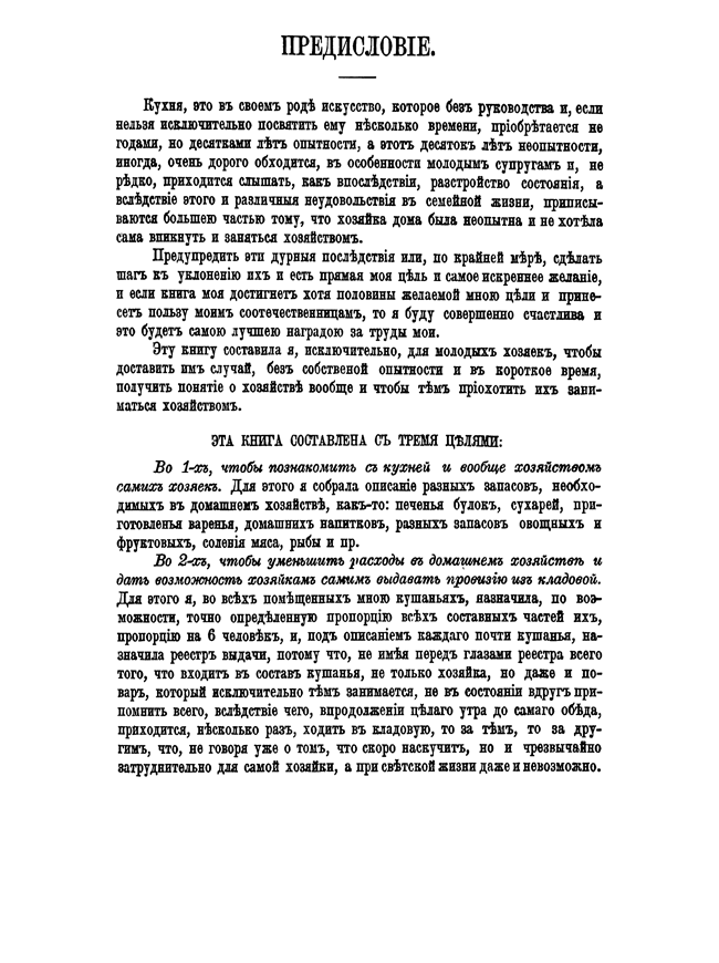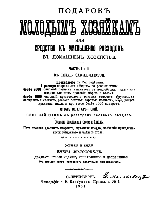 Выпускница Смольного института для благородных девиц, Елена Молоховец стремилась помочь молодым хозяйкам при небольшом состоянии и умеренном расходе иметь постоянно вкусный, здоровый и разнообразный обед.