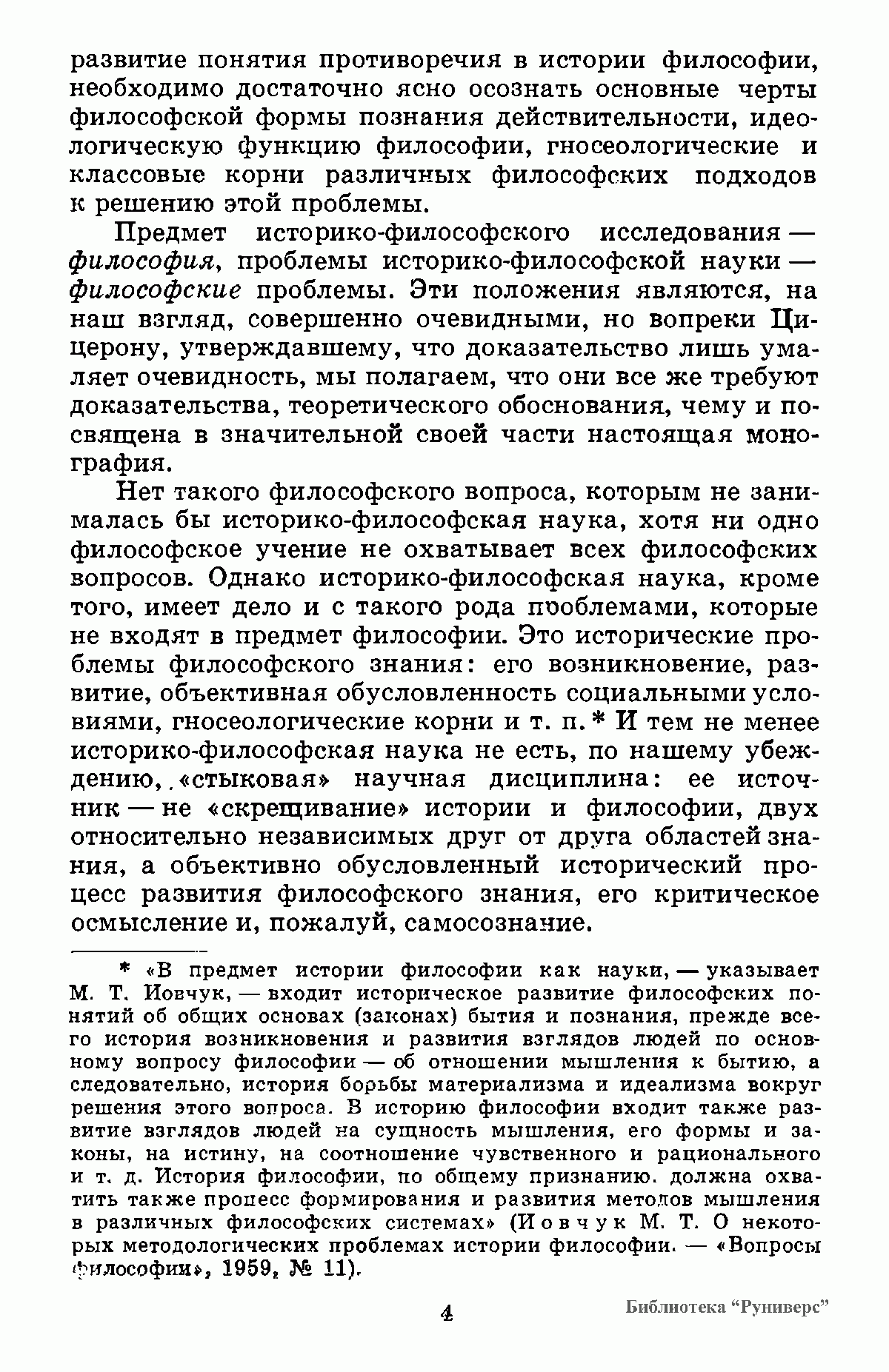 На основе сравнительного анализа философских учений прошлого и настоящего автор исследует специфику философской формы познания, структуру философского знания, исторически преходящий характер дивергенции философских учений, изменение места философии в системе научных знаний, развитие предмета философии, превращение философии в научное мировоззрение, взаимоотношение философии и частных наук, природу философского спора, идеологические функции философии.
